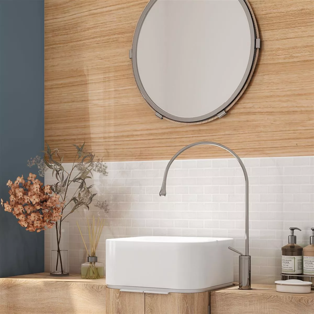 The ceramic mosaic tiles "Eldertown Brick White" give your room a charming elegance. With a glossy surface, rectangular format (30.3x30.6cm) and a stone size of 48x98mm, these mosaic and wall tiles are a stylish addition to living rooms, kitchens and showers. A mat (0.092m²) weighs only 1.5 kg and is easy to handle thanks to its thickness of 7mm. The joint width of 3mm creates a harmonious appearance. The suitability for wet areas makes them versatile.