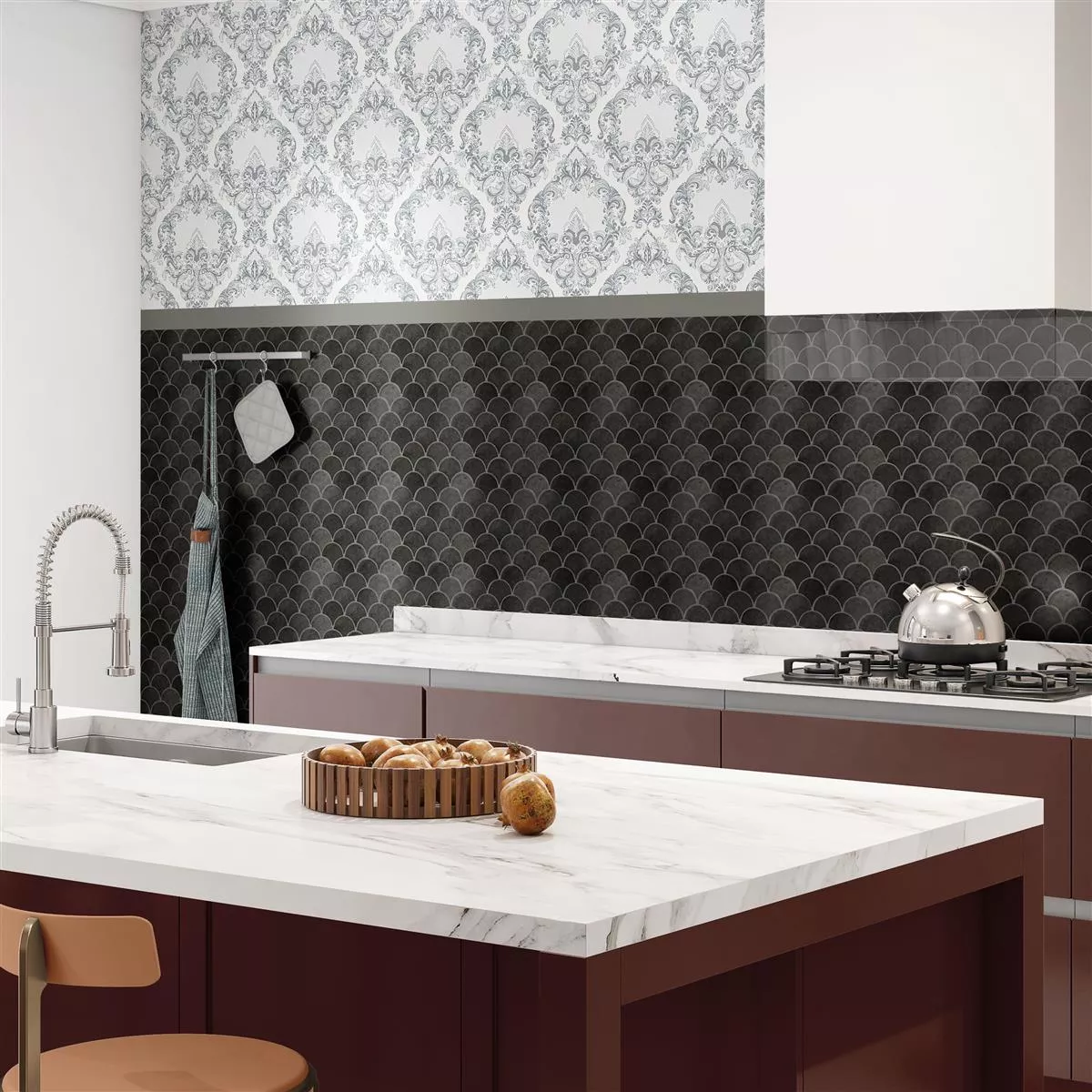 The ceramic mosaic tiles "Eldertown Fan Black" give your room a unique dynamic. With a fan look (29.2x30.3cm) and a glossy surface, these mosaic and wall tiles are a stylish addition to interior areas, kitchens, living rooms, wet areas and showers. A mat (0.088m²) weighs only 1.25 kg and is easy to handle thanks to its thickness of 7mm.