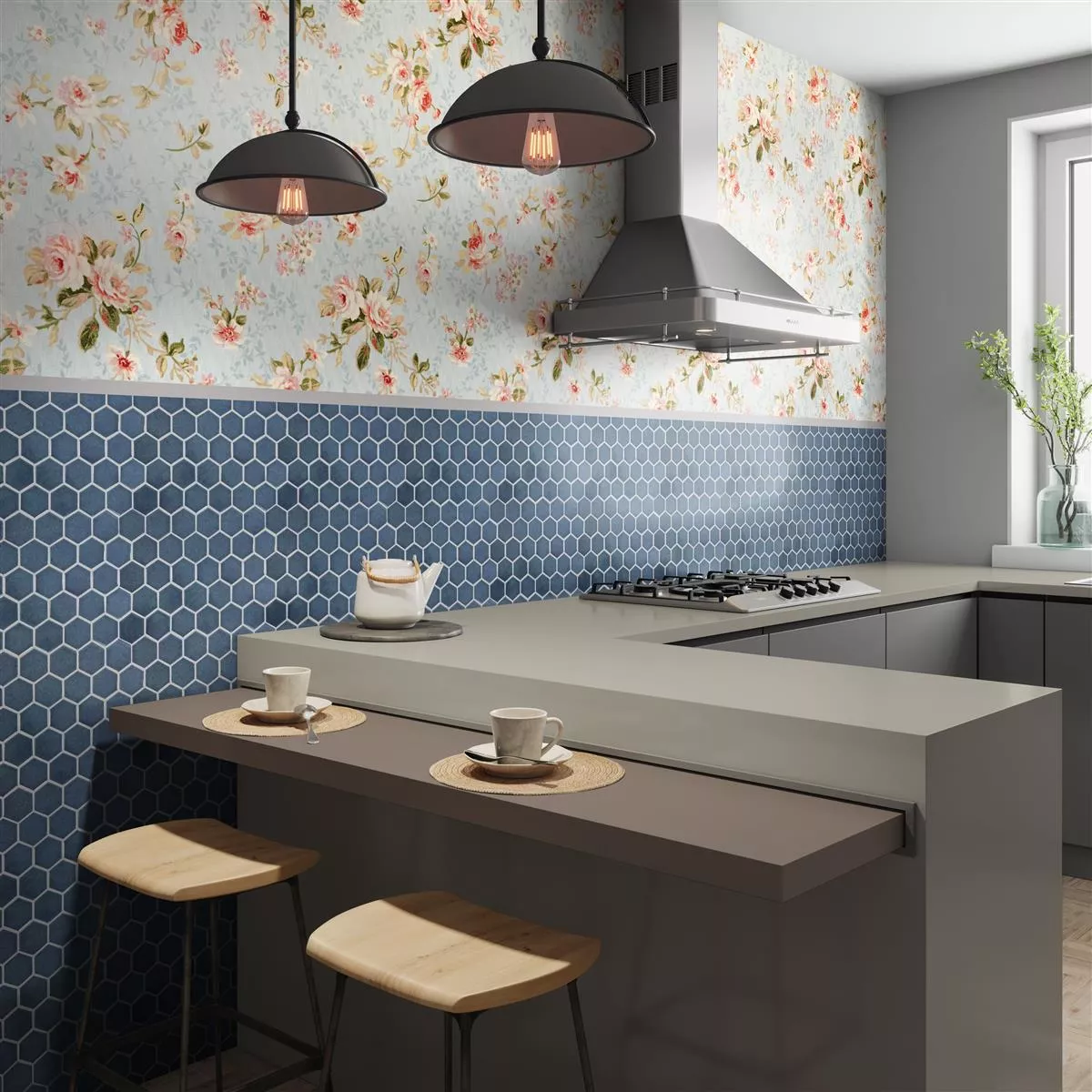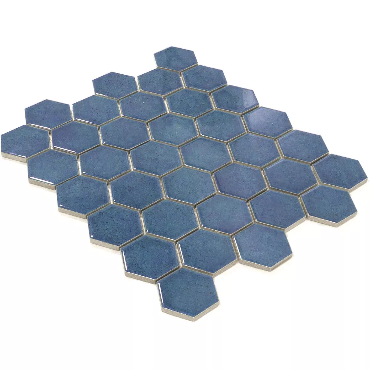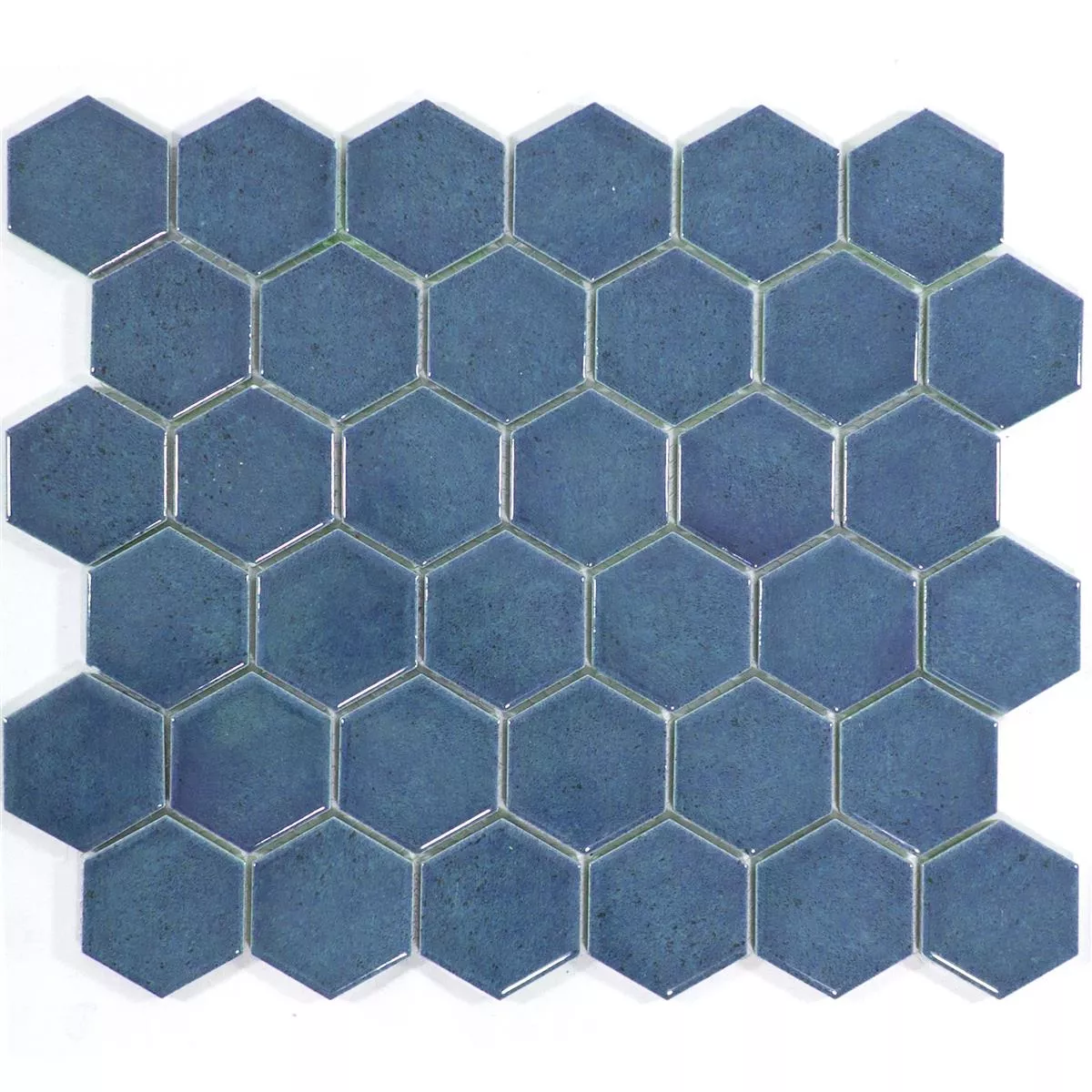 The "Eldertown Hexagon Dark Blue" ceramic mosaic tiles give your room a refreshing elegance. In a modern hexagon format (32x28cm) and a glossy surface, these mosaic and wall tiles are a stylish addition to the kitchen, shower, wet area and living room. A mat (0.092m²) weighs only 1.25 kg and is easy to handle thanks to its thickness of 7mm.