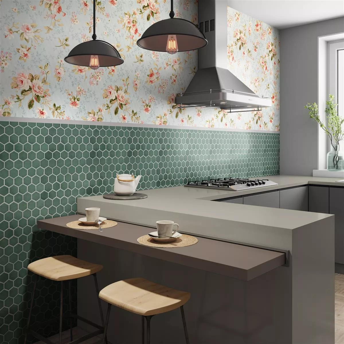 The ceramic mosaic tiles "Eldertown Hexagon Dark Green" combine timeless design with modern flair. With a glossy surface and hexagonal format (32x28cm), these mosaic and wall tiles offer an elegant solution for the kitchen, shower and living room. A mat (0.092m²) weighs only 1.25 kg and is easy to handle thanks to its thickness of 7mm. The joint width of 3mm creates a harmonious appearance.