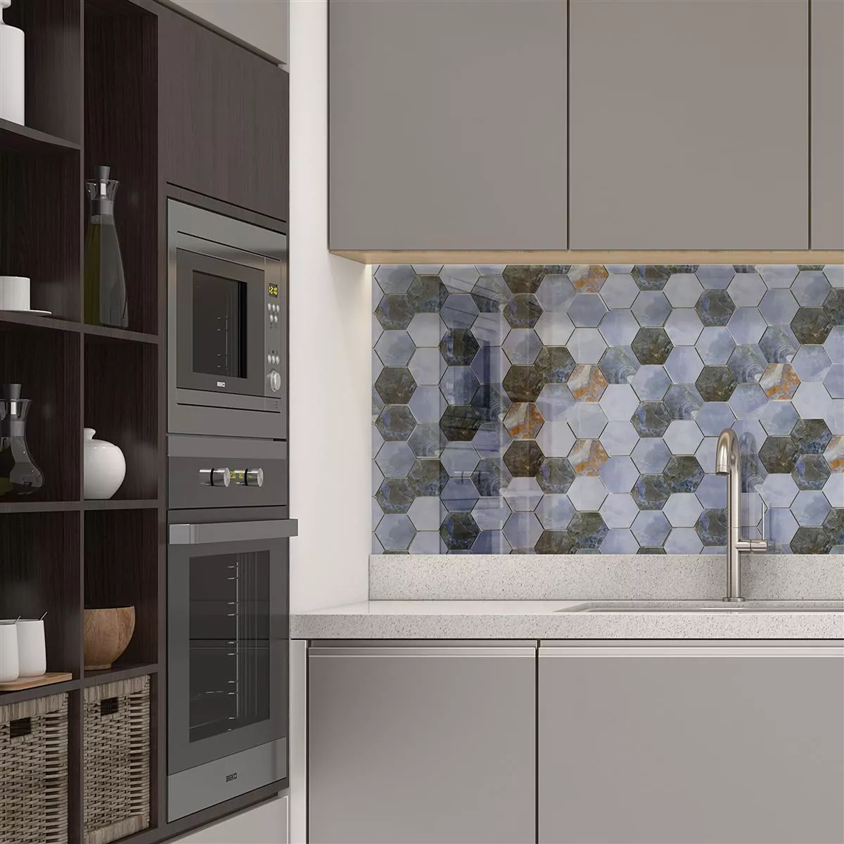 The rectified edges give the tiles a precise geometry that allows for flawless installation. With a thickness of 10.7mm and a stone size of 88x71mm, they set accents not only on a visual level, but also in terms of structure. The hexagon format, as a modern interpretation of geometric shapes, fits seamlessly into contemporary interior designs.