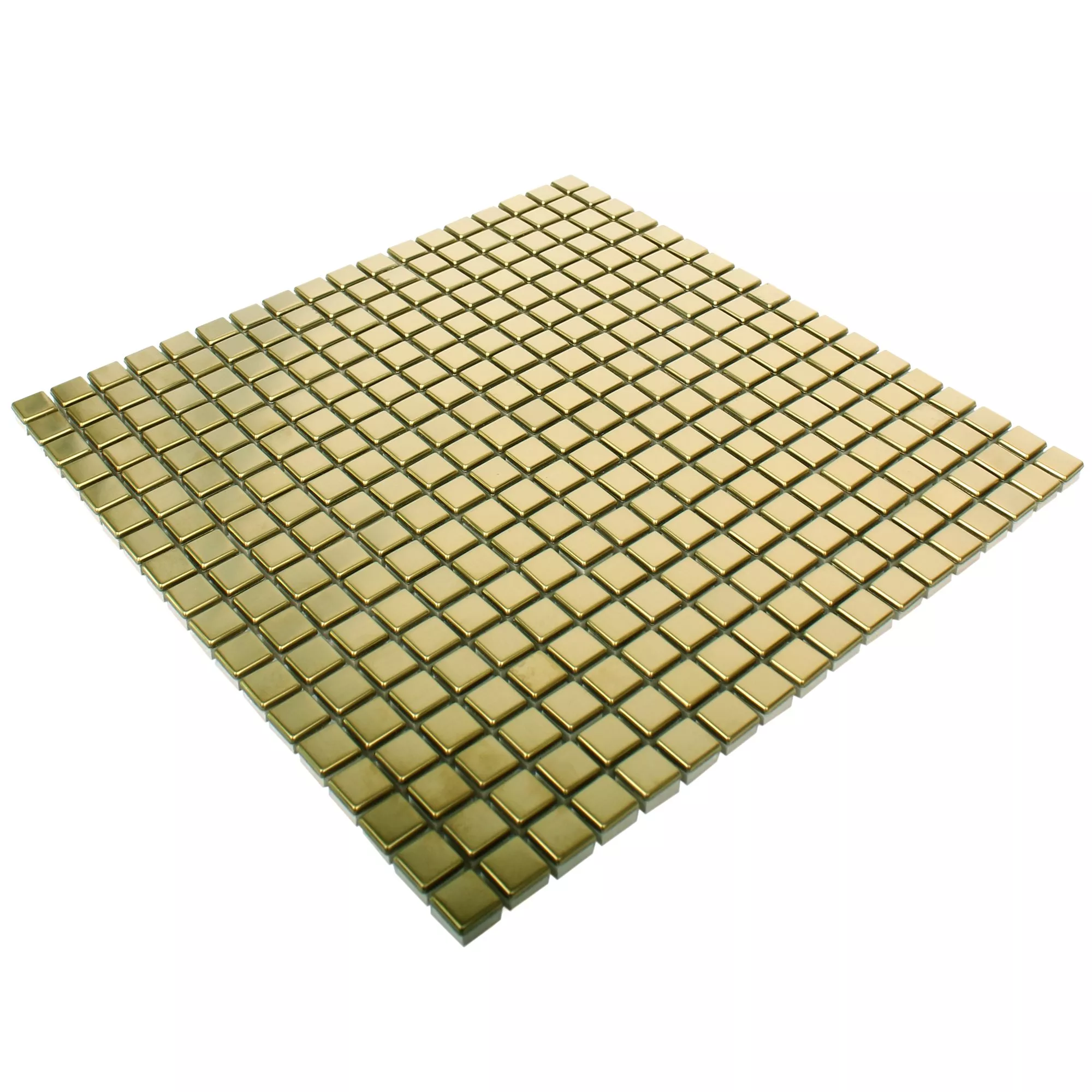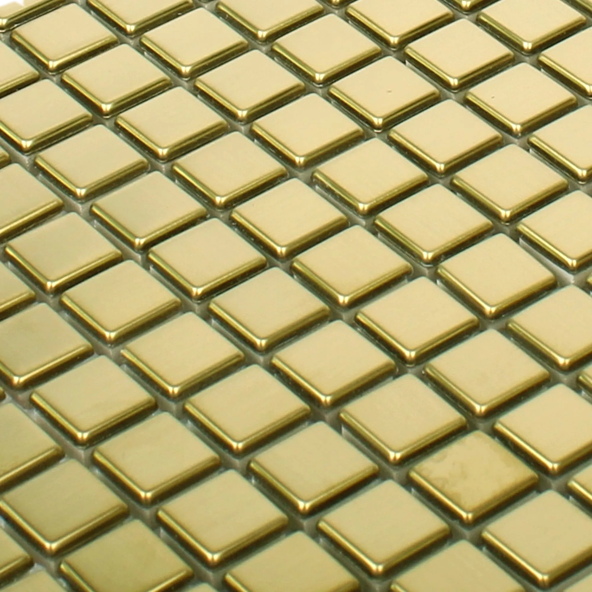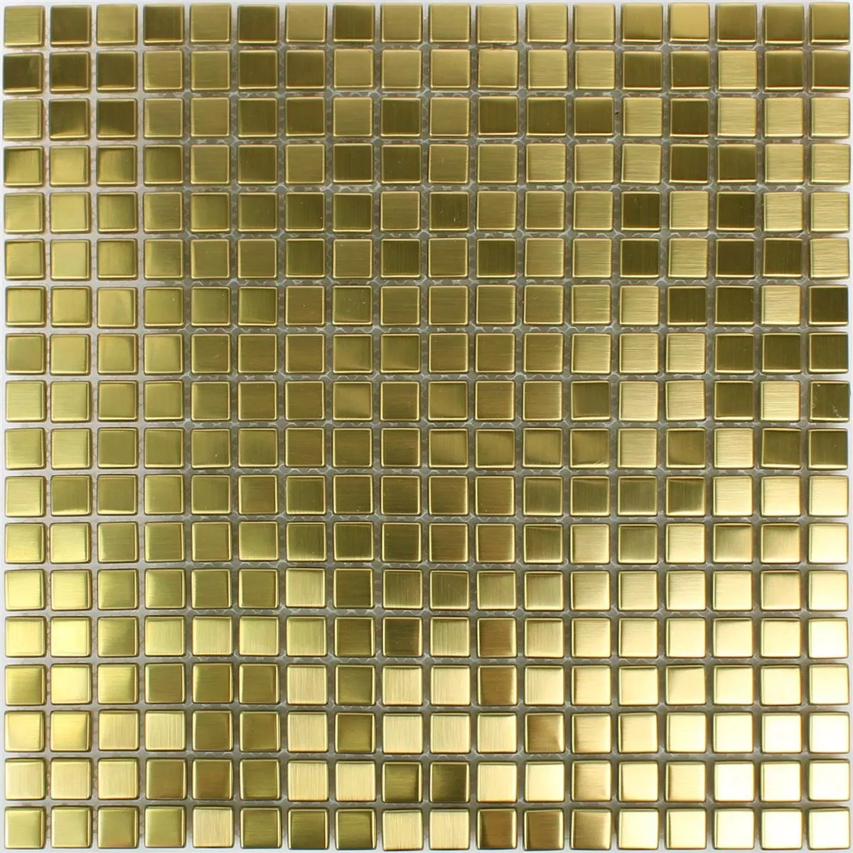 Los mosaicos de acero inoxidable metal Baikal Gold dejan que toda la estancia brille con su cálido brillo dorado. También les iría muy bien en el baño. Pero los mosaicos de acero inoxidable metal Baikal Gold no son aptos como azulejos de baño. Por supuesto, las baldosas de baño de este tipo también están disponibles comercialmente.