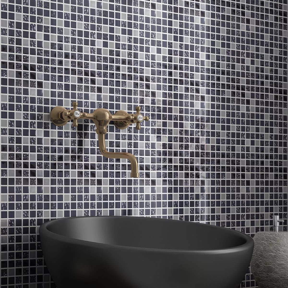 El mosaico Blackriver en negro y plata combina vidrio y acero inoxidable para crear una elegante mezcla de materiales. Este mosaico de vidrio es adecuado tanto como mosaico de acero inoxidable como como revestimiento de pared, y ofrece un acabado elegante, brillante y caído.