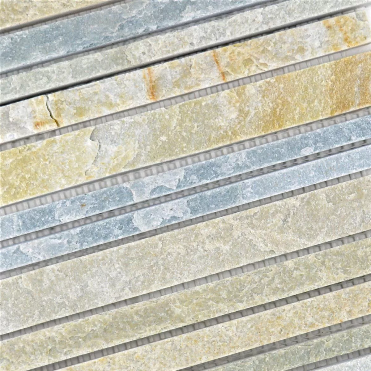 Los mosaicos de Cuarcita Linus Stick son un producto natural. La materia prima de cuarcita no sigue ningún patrón habitual. ¿Qué es la cuarcita? Una roca metamórfica con un contenido de cuarzo del 98 por ciento, lo que hace que las tejas sean robustas. Una propiedad principal es la resistencia a las influencias ambientales como el sol, el calor, el frío y la lluvia intensa. Estas teselas son perfectas para uso en exteriores donde están expuestas a elementos extremos. Además, las piedras embellecen la sala de estar en conexión con un rincón con chimenea. El calor ascendente no daña el revestimiento de la pared. Las piedras individuales de 10 x 300, 15 x 300 y 25 x 300 milímetros se fijan sobre prácticas esteras. La alternancia de piezas anchas de roca da como resultado un patrón inconfundible. La alfombra mide 30 x 30 centímetros y tiene 10 milímetros de espesor.