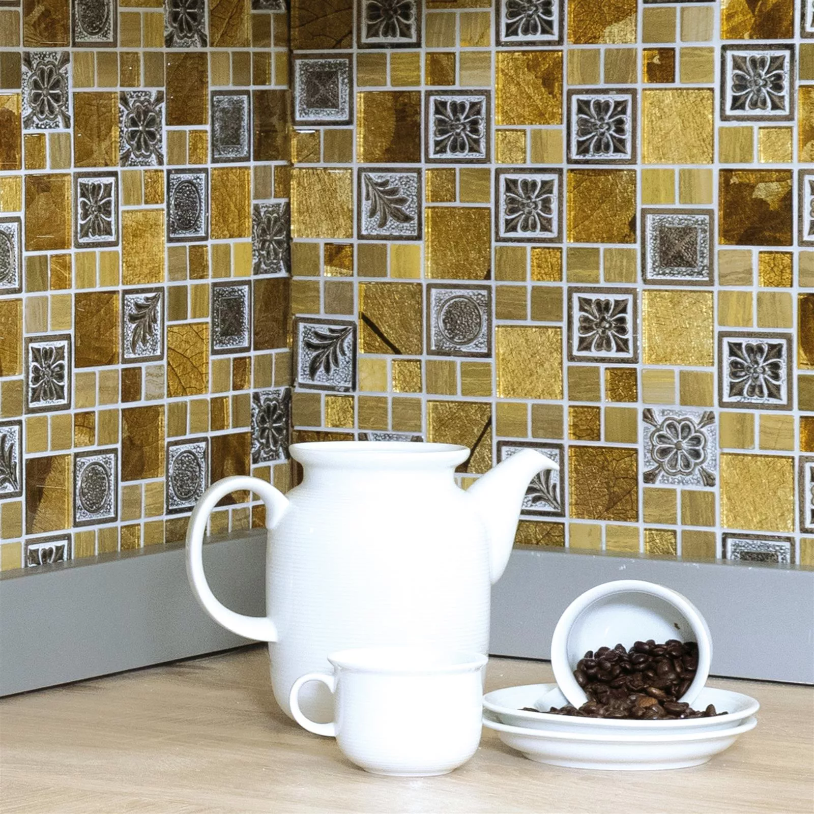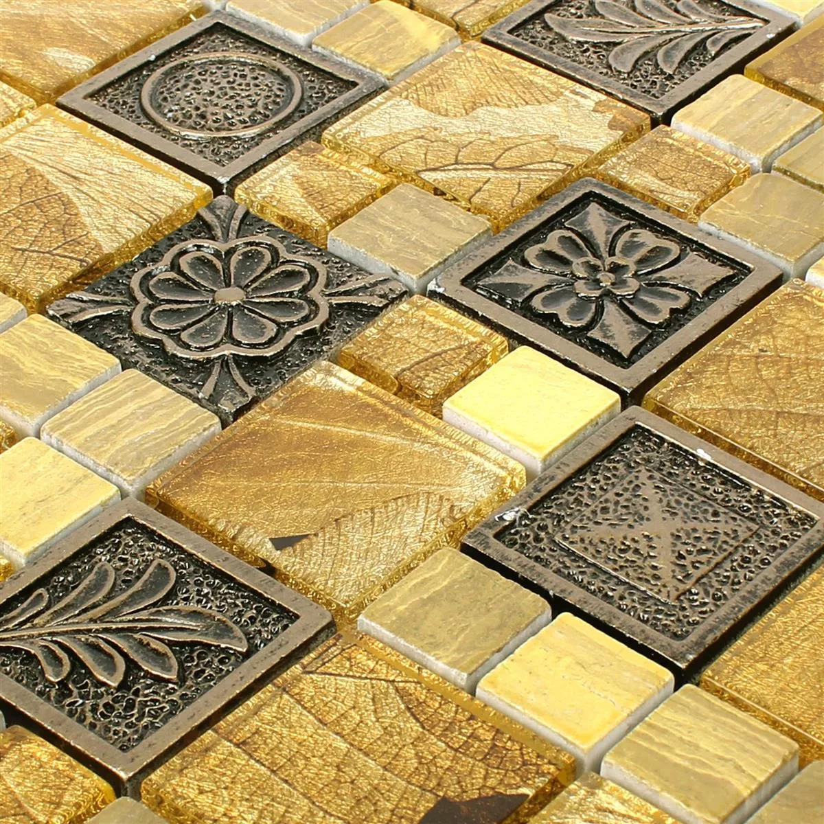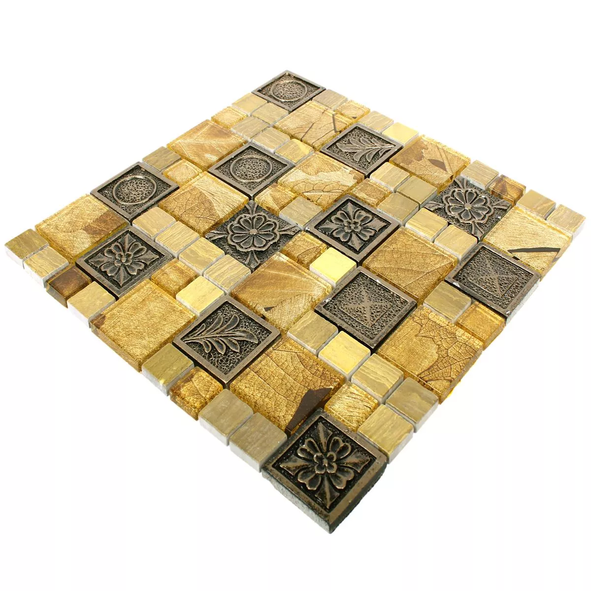 El mosaico Levanzo Glass Resin Ornament Mix Gold le da a su terraza cubierta o sala de estar un aspecto místico y oriental. Cubren exactamente este tipo de look retro que es muy popular en este momento.