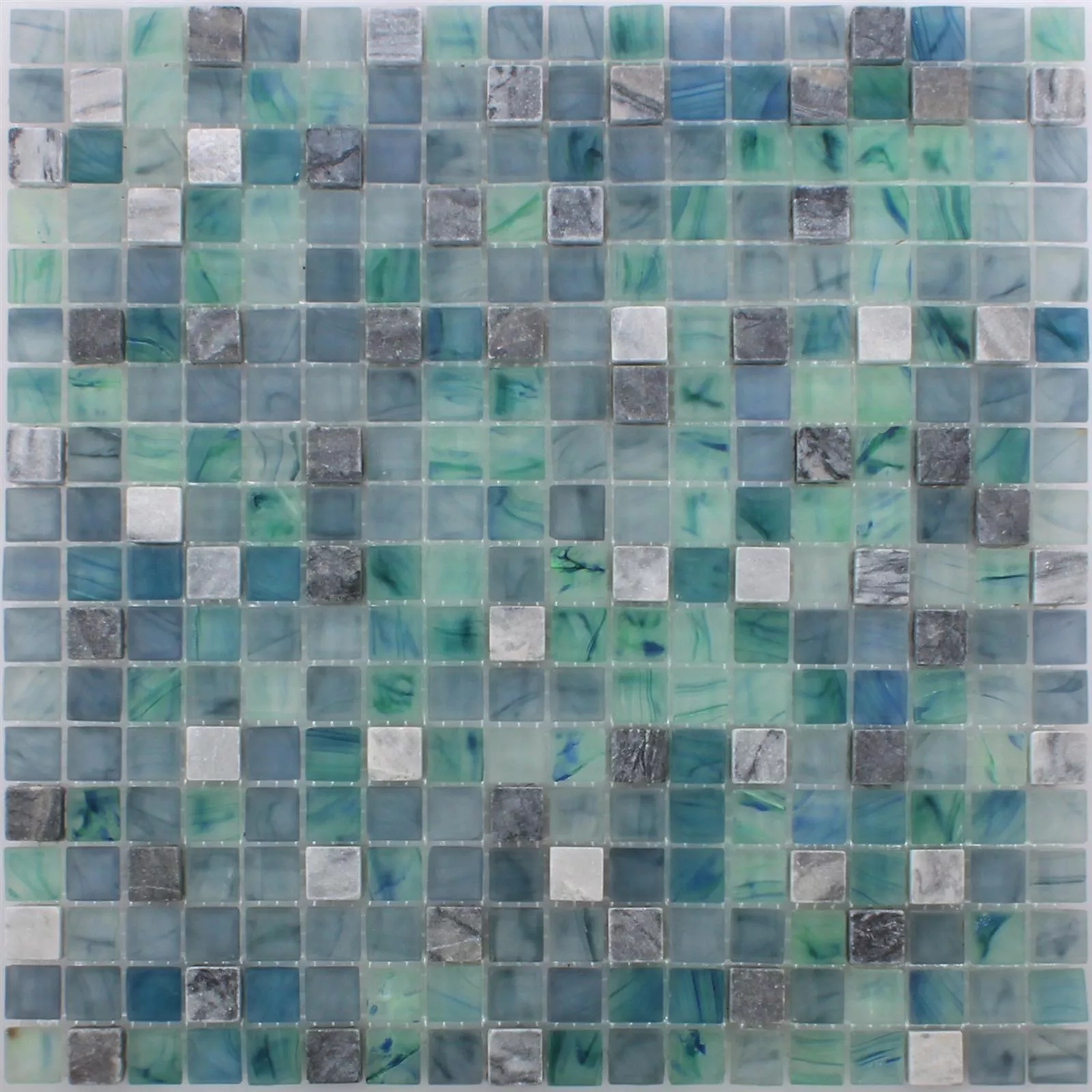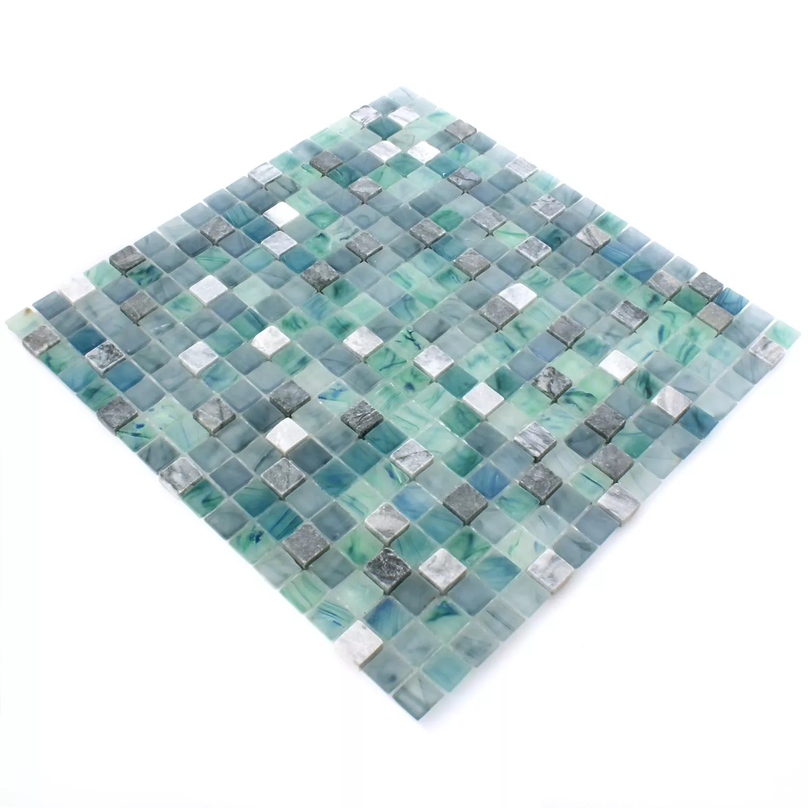 Esta versión tiene un tamaño de piedra de 15 x 15 centímetros y está disponible en acabado brillante o mate. Las dimensiones del tapete son 29,5 x 29,5 centímetros. Este diseño de azulejo consiste en una combinación de mármol y vidrio y tiene un grosor de 0,6 milímetros. Un tapete tiene un tamaño de 0.087 metros cuadrados. El formato es cuadrado y esta versión es principalmente apta para uso interior y aquí principalmente para la zona húmeda de aseos o baños.