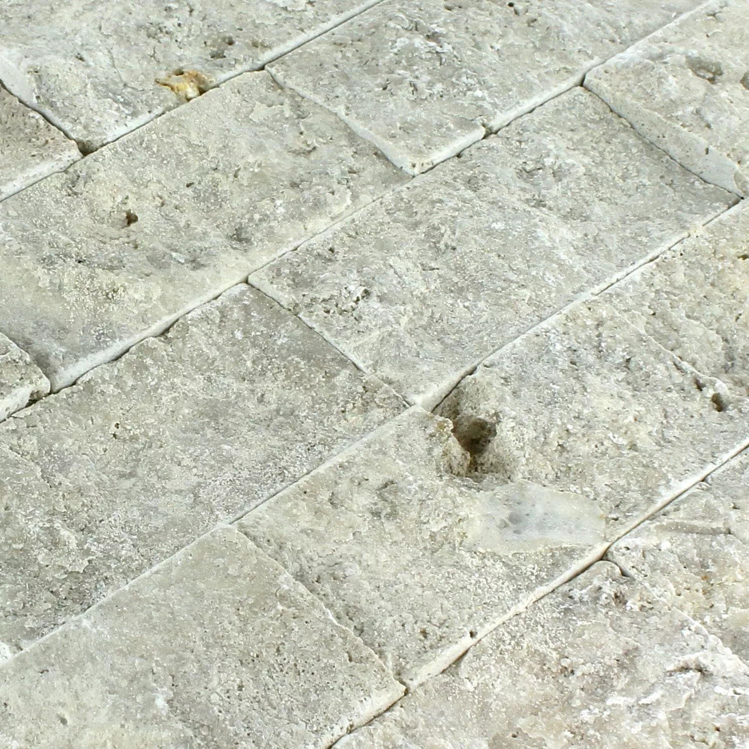 Como todas las baldosas de piedra natural, las baldosas de mosaico son fáciles de cuidar, por lo que, incluso años después, siguen estando como el primer día. Por lo tanto, las baldosas de piedra natural son la alternativa perfecta a todos los papeles pintados y paneles de madera. Son una buena inversión en cualquier hogar. Los hermosos mosaicos a menudo se colocan en nuevos edificios. Pero también se pueden reequipar en poco tiempo en todos los edificios antiguos, de modo que estas baldosas de piedra natural también garanticen un ambiente agradable en el edificio antiguo. El modelo de baldosas de piedra natural Sumba Silver Brick también se puede combinar de manera óptima con los otros matices de color de la serie Brick, de modo que las subáreas se pueden separar sutilmente entre sí, especialmente en habitaciones grandes. Los azulejos de travertino presentan un estilo de vida atemporal y elegante en cada pared, al que se adaptan perfectamente tanto los muebles de diseño como los muebles de casa de campo y muchos otros muebles.