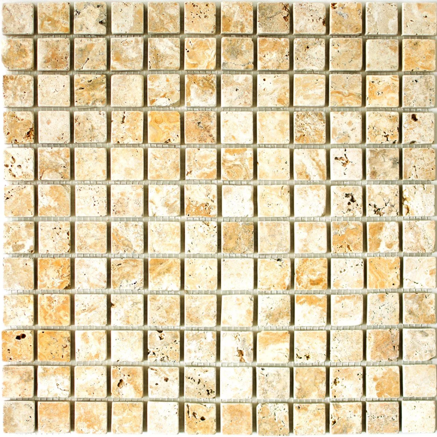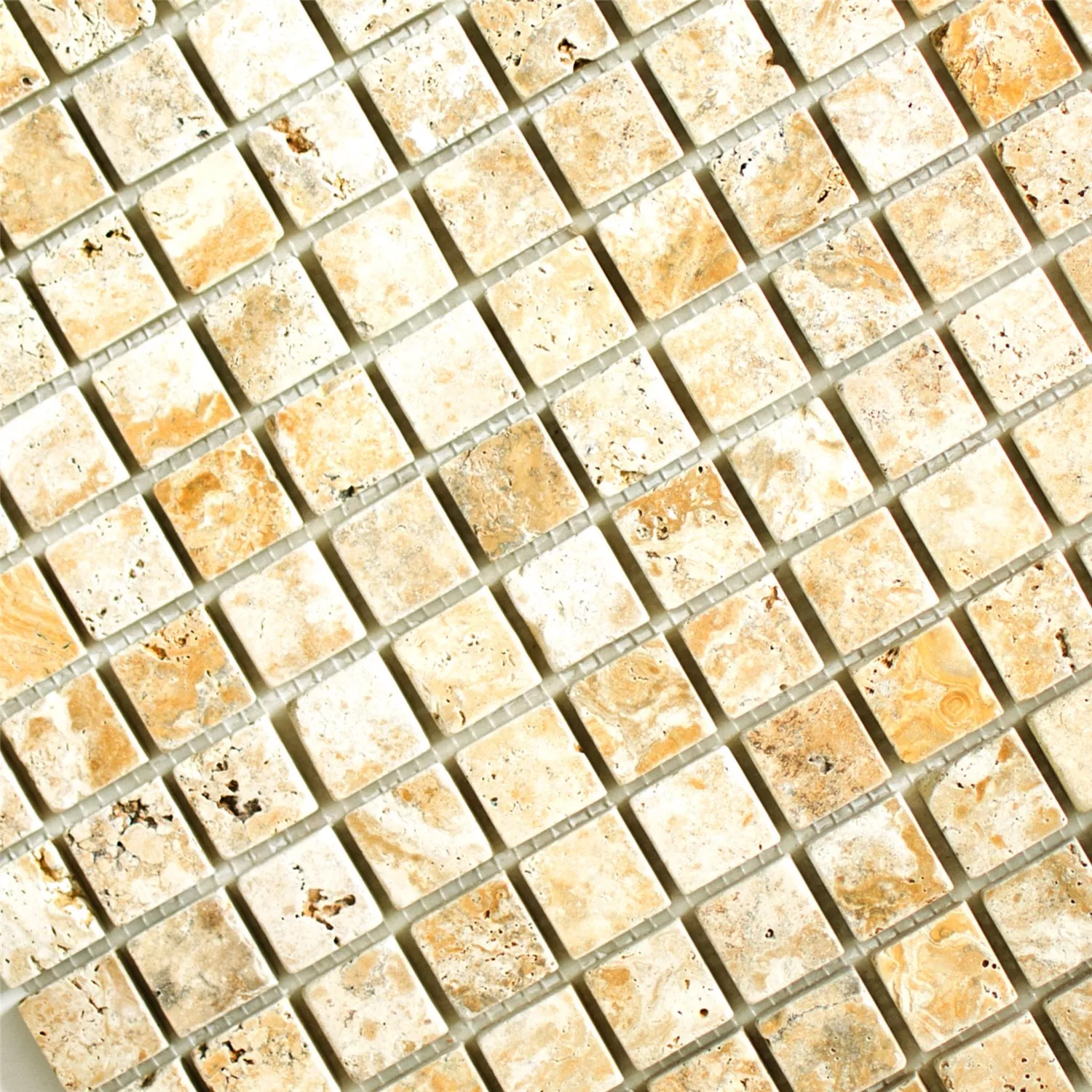 Los mosaicos Travertin Castello Gold 23 son un producto natural. El travertino, la piedra de Tivoli, tiene un encanto particularmente marítimo y su superficie porosa hace que este producto natural sea tan atractivo. Estos mosaicos, etiquetados como Travertine Gold, también tienen un cierto brillo dorado en el hermoso esquema de colores. Se trata de baldosas naturales que además actúan con naturalidad y su vivacidad superficial.