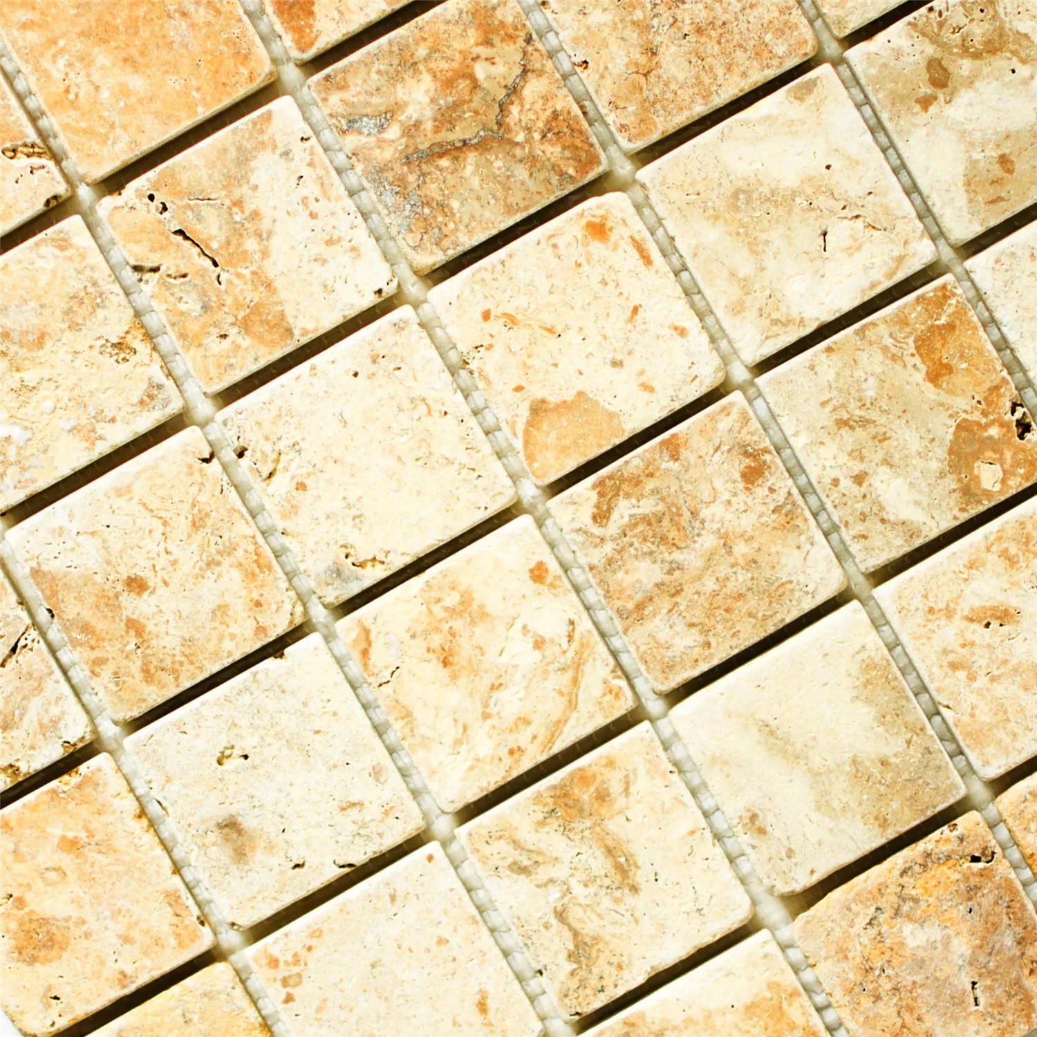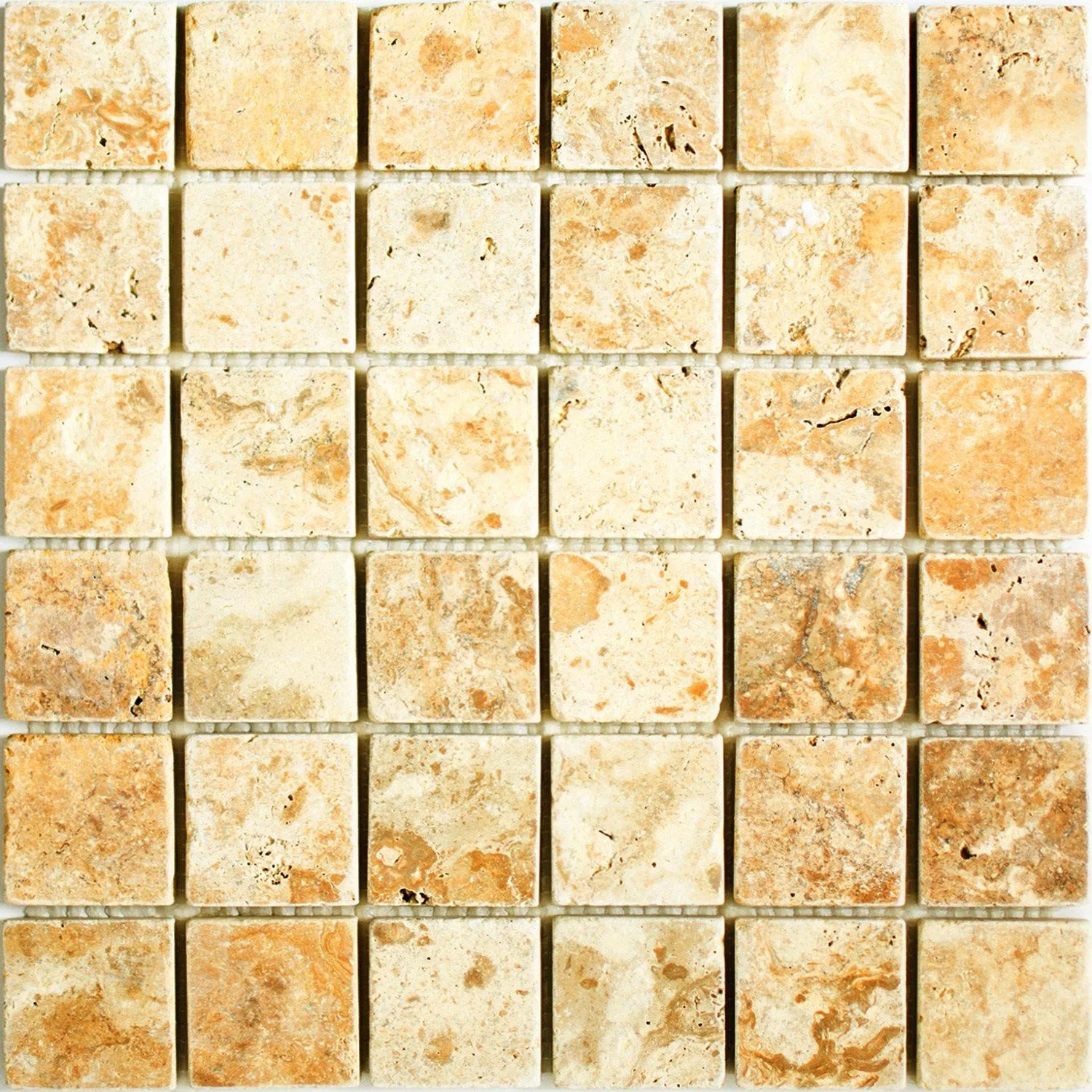 Los mosaicos Travertin Castello Gold 48 son un producto natural. El travertino, la piedra de Tivoli, tiene un encanto particularmente marítimo y su superficie porosa hace que este producto natural sea tan atractivo. Estos mosaicos, etiquetados como Travertine Gold, también tienen un cierto brillo dorado en el hermoso esquema de colores. Se trata de baldosas naturales que además actúan con naturalidad y su vivacidad superficial.