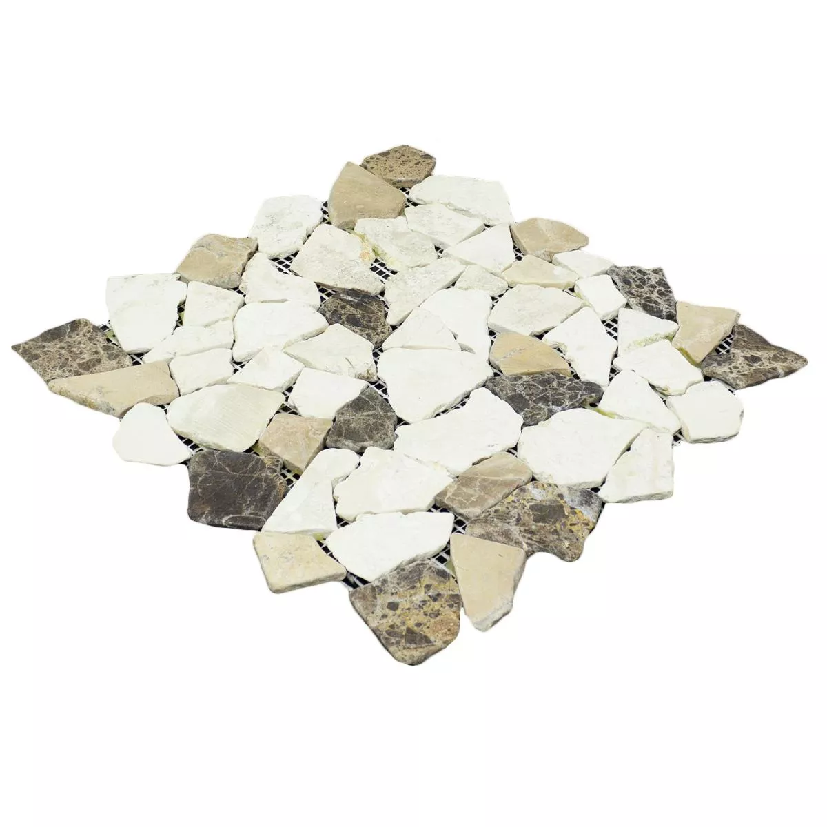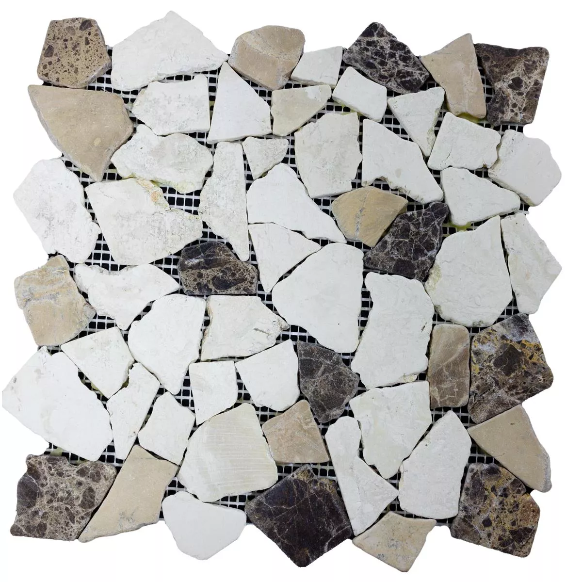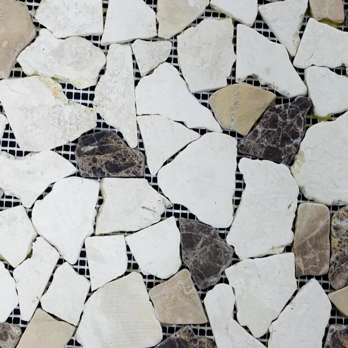 Sumérgete en la belleza atemporal con nuestros mosaicos rotos de mármol Dolcevista Marrón Blanco. Estos mosaicos, azulejos de pared y piso con tamaños de piedra variables de 15 a 69 mm añaden una cálida elegancia a sus áreas interiores y exteriores. La superficie mate y un ancho de junta de 0-15 mm subrayan el encanto natural del mármol.