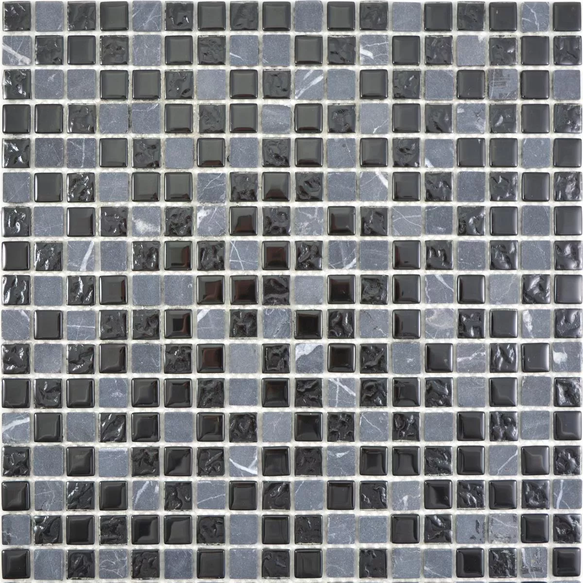 Los mosaicos de piedra natural de vidrio Zekova en la variante de color gris negro se componen alternativamente de mármol y vidrio. El mosaico de piedra natural de vidrio Zekova tiene un tamaño de piedra de 15 x 15 mm. Además, las piedras tienen alternativamente una superficie mate y brillante.