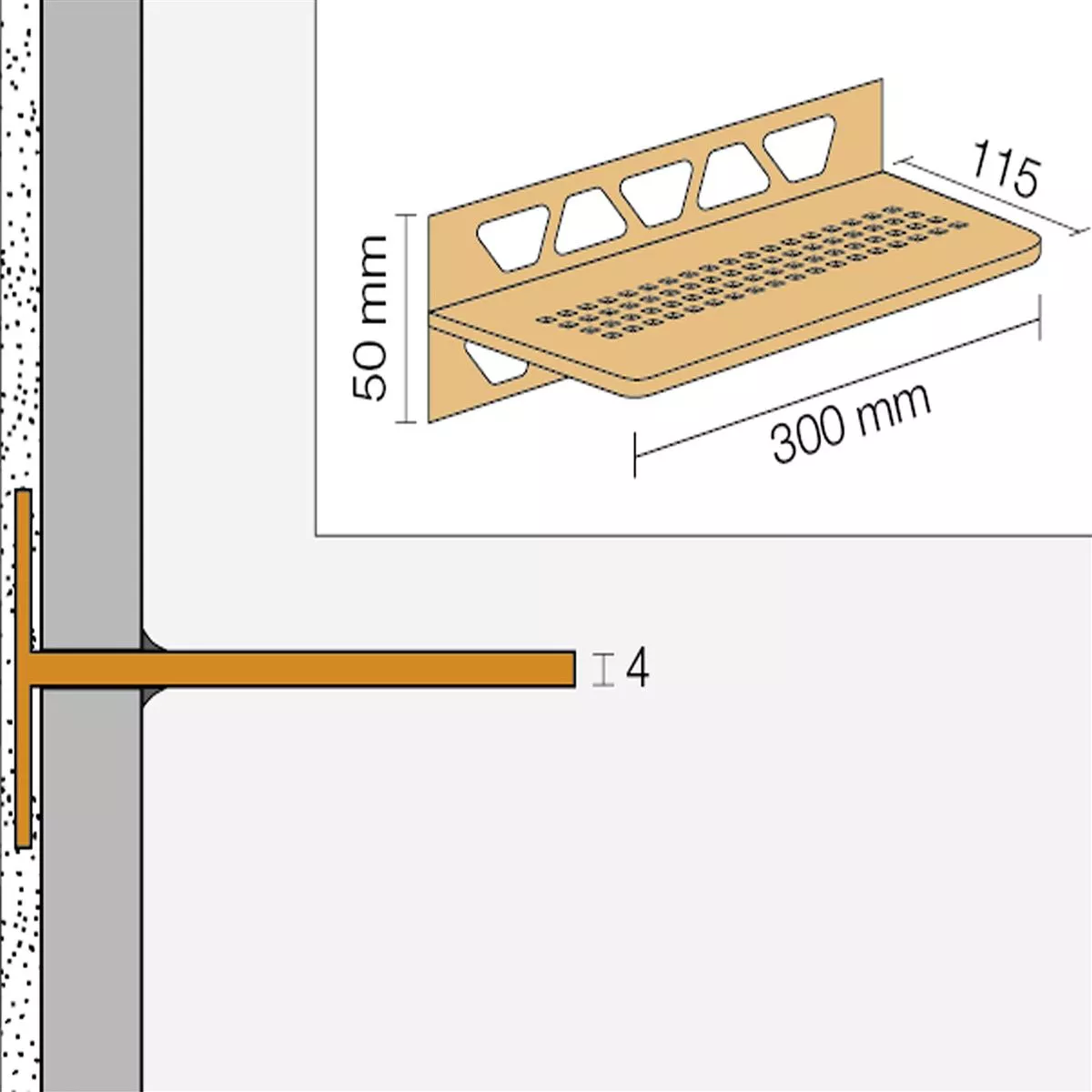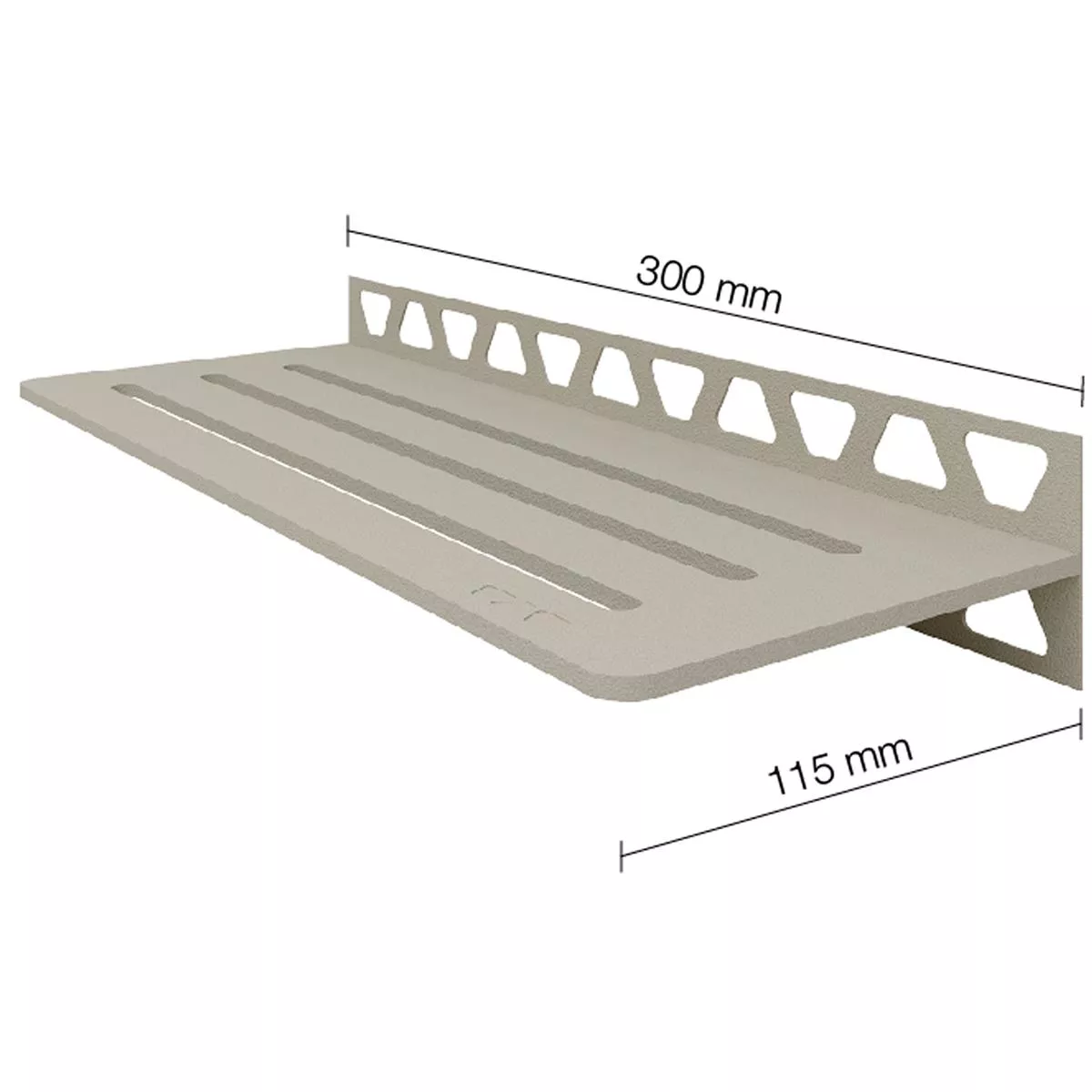 Los estantes Schlüter-SHELF-W miden 30 cm × 11,5 cm y, por lo tanto, ofrecen suficiente espacio para, por ejemplo, jabones o especias.