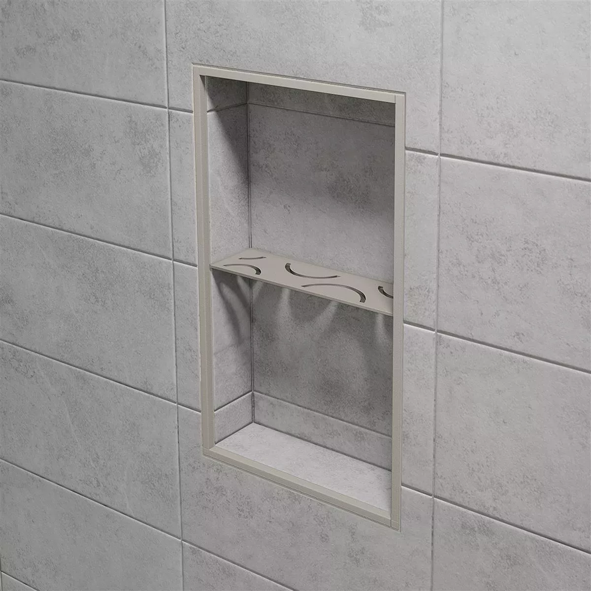 Schlüter-SHELF-N-S1 Gris Estante de pared rectangular para nicho Con Schlüter-SHELF-N-S1 podrá equipar el nicho prefabricado Schlüter-KERDI-BOARD con un estante que se ajuste perfectamente al colocar los azulejos. Eso no es todo: también tendrá la máxima flexibilidad en términos de material y diseño. La estantería de pared de alta calidad está hecha de acero inoxidable cepillado o de aluminio con revestimiento estructurado.