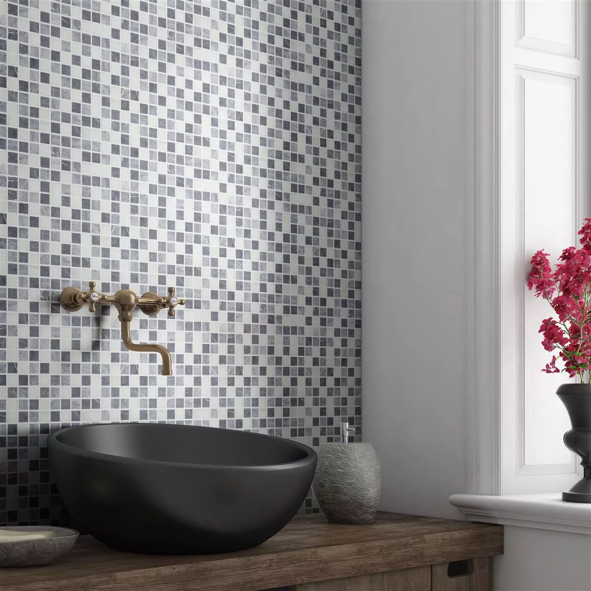 Los mosaicos de mármol Stanford en gris y blanco combinan elegancia natural con propiedades funcionales. Elaboradas con mármol de alta calidad, estas baldosas ofrecen un acabado mate que crea un aspecto elegante y sofisticado a la vez que son prácticas y fáciles de mantener.