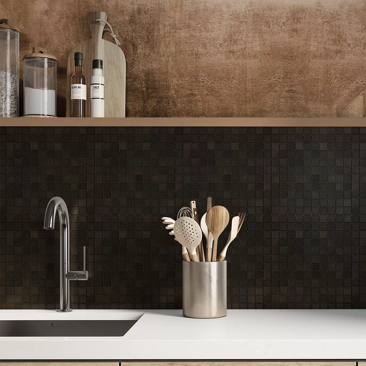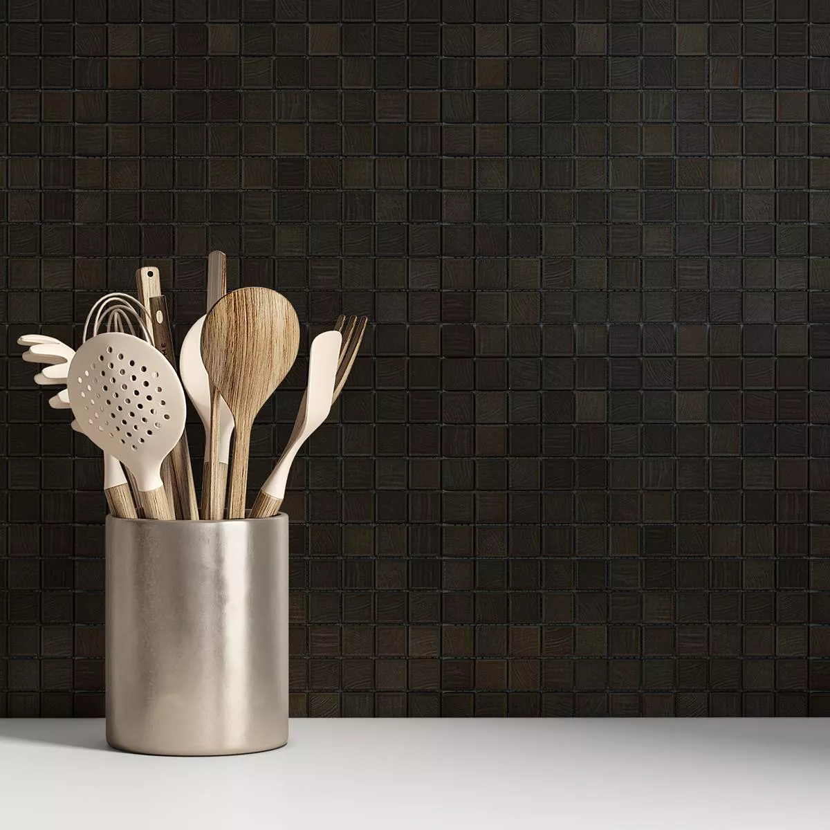 El mosaico cerámico Luminara en elegante color antracita combina un diseño moderno con la máxima funcionalidad. El acabado mate con efecto madera añade una estética atemporal y elegante a cualquier ambiente, mientras que el tamaño de piedra de 23 x 23 mm está dispuesto sobre una alfombra de 29,7 x 29,7 cm pegada a una malla lista para su instalación. Esto hace que la instalación sea sencilla y precisa.