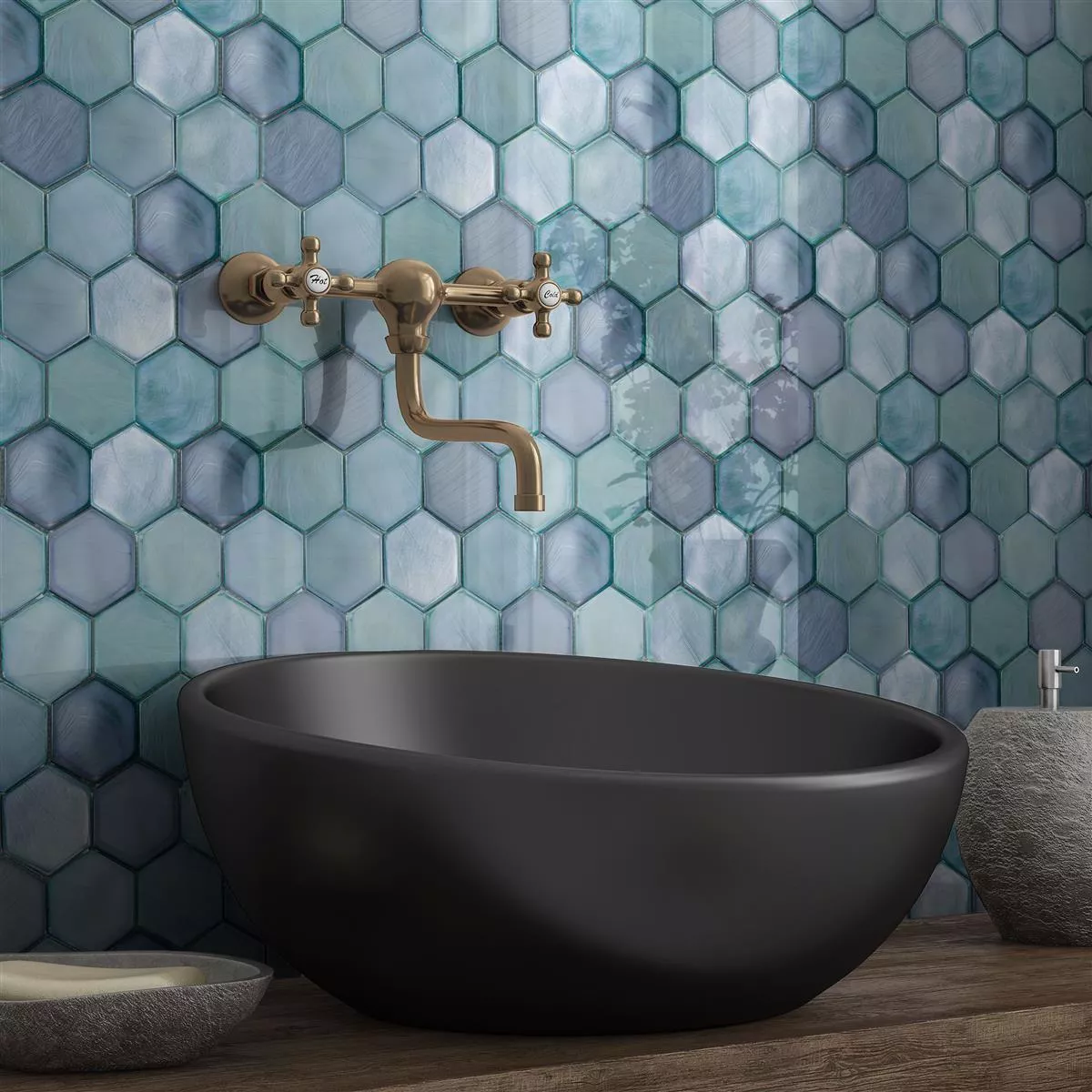 Los mosaicos de vidrio Andalucia Hexagon en color verde mar se presentan como elementos de diseño de pared modernos y refrescantes para habitaciones como el baño, la cocina, el salón y la ducha. El vibrante verde mar confiere a los azulejos una atmósfera atractiva y estimulante. Además, la superficie brillante con efecto nácar confiere a los azulejos un aspecto elegante.