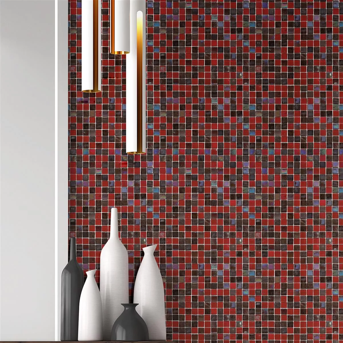 Los mosaicos de vidrio Salsa en los intensos colores rojo y negro serán un complemento elegante para sus habitaciones.