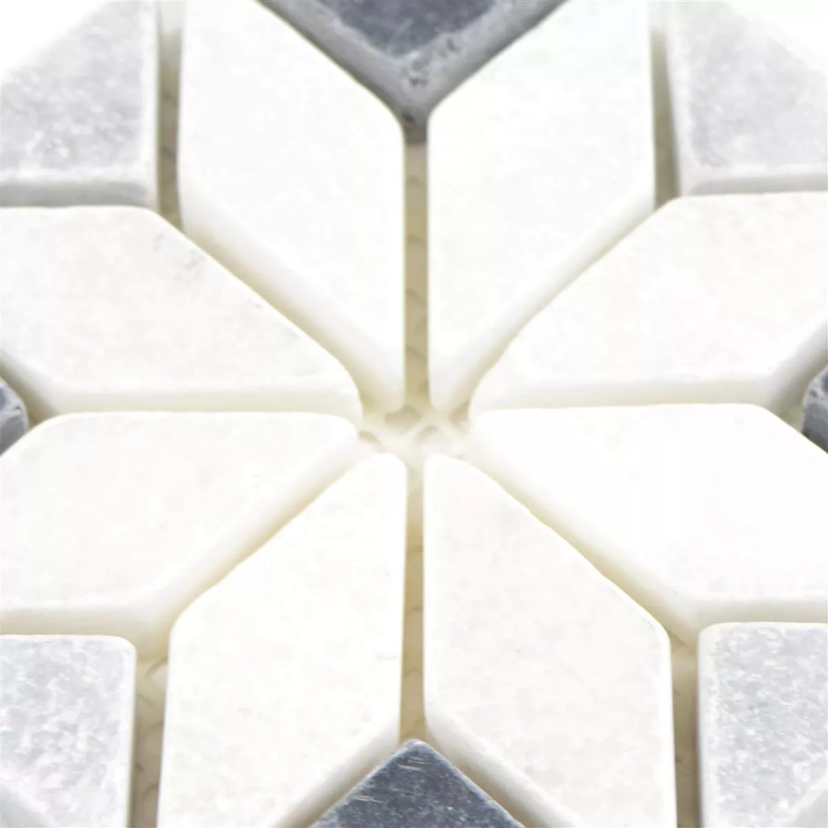 El travertino de piedra natural se utilizó en la producción. El foco principal del azulejo es una especie de flor, que es el patrón principal de las piedras de mosaico.