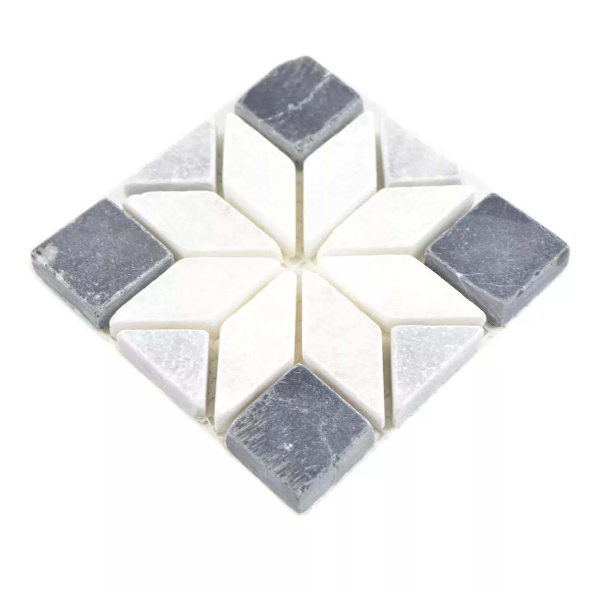 Un tapete de azulejos cuadrados, que consta de azulejos de diferentes tamaños. Ese es el azulejo de piedra natural Rosone Carolina en negro, blanco y gris. Esta baldosa tiene un bonito patrón de mosaico y se puede utilizar bien como baldosa decorativa. No es necesario equipar un piso entero o una pared entera con esta baldosa. También se puede configurar como un borde o completamente por separado. Llama la atención en todas las opciones utilizadas.