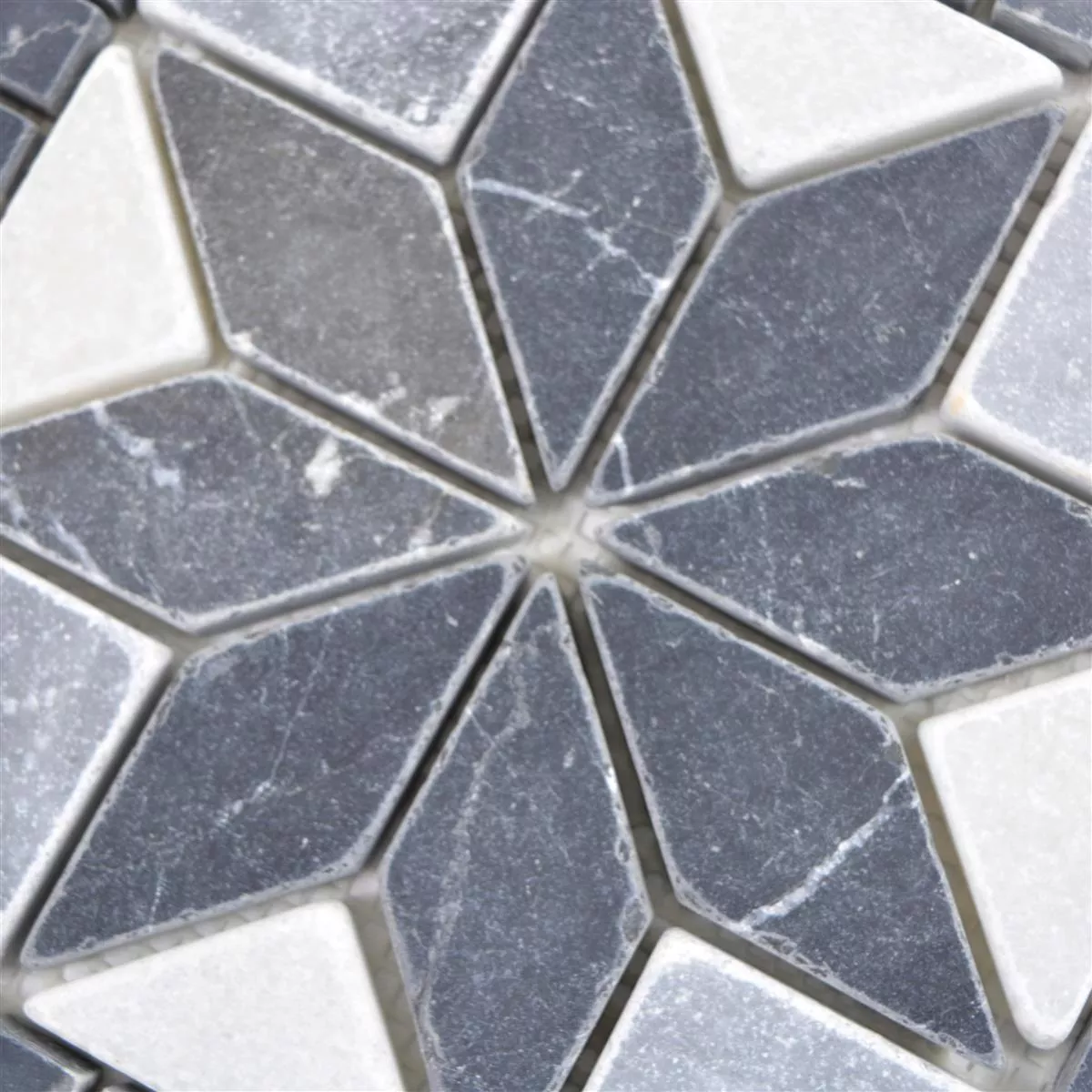 La baldosa de piedra natural Rosone Lizard es una belleza helada. Es negro, blanco y gris y recuerda a un copo de nieve, una estrella de invierno o una helada. Es una agradable frescura que exuda este azulejo. El suelo de baldosas parece fresco invernal, pero sin parecer frío y repulsivo. A pesar de los colores vivos, el ambiente es agradable y acogedor.