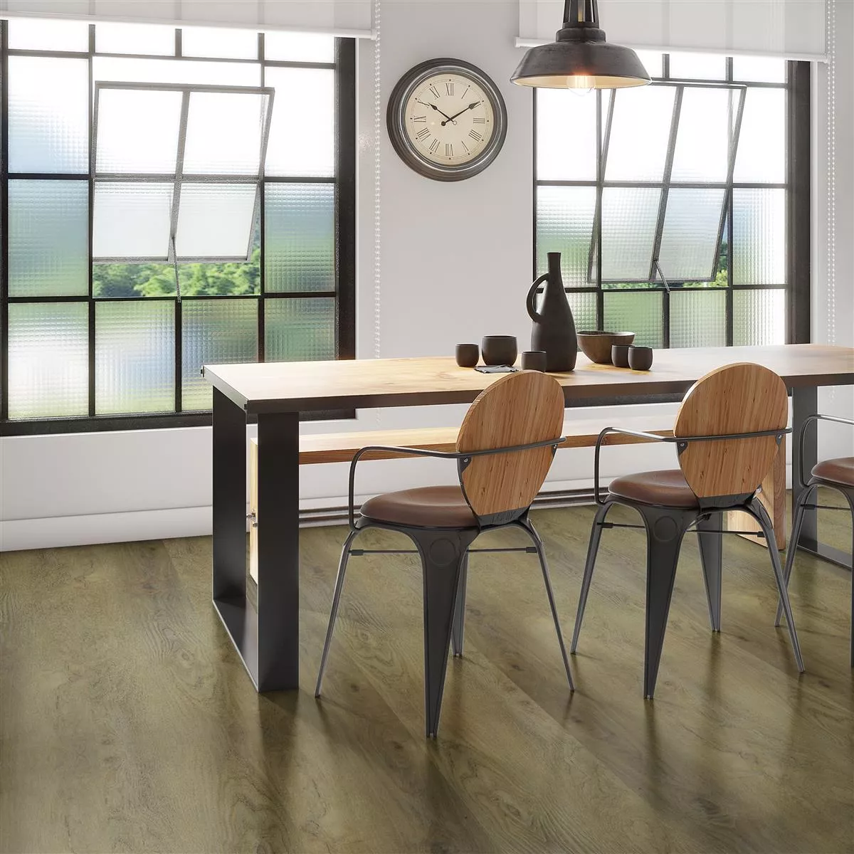 Fabricado con vinilo resistente, este revestimiento de suelo se caracteriza por su compatibilidad con la calefacción por suelo radiante, un cómodo sistema de clic y una superficie antideslizante. El aspecto de madera aporta a sus habitaciones un carácter natural, mientras que el color topo añade un matiz sutil y elegante.