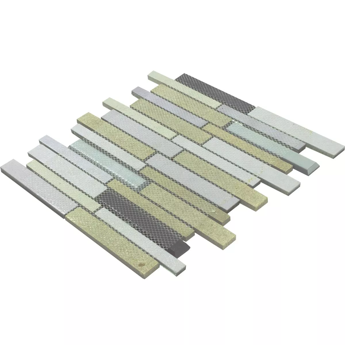 La mezcla de cerámica, piedra natural y vidrio confiere a estos azulejos una estructura fascinante y un acabado brillante. Los diferentes tamaños de piedra de 15x148 mm y 23x148 mm le dan al área un aspecto vivo y moderno.