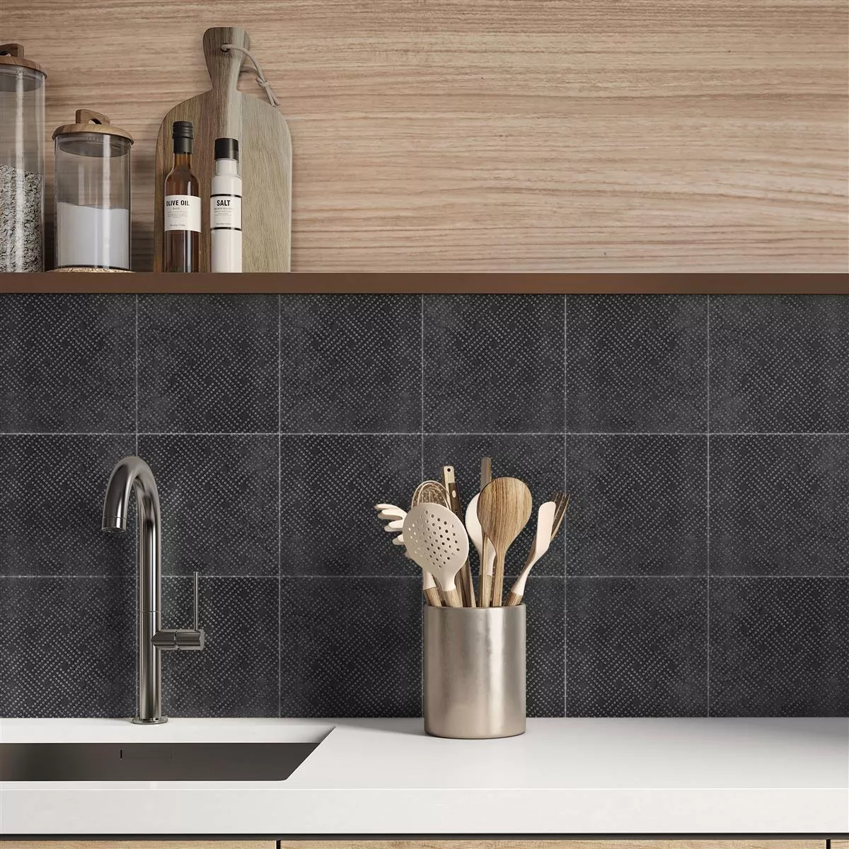 A package of these tiles covers 0.45m², and the square format makes them flexible for use in bathrooms, wet areas, kitchens, interiors, living areas and showers. "Chicago metal look anthracite R9 - 18.5x18.5cm Pattern 1" offers not only aesthetic sophistication, but also practical applicability for a wide range of interior designs.