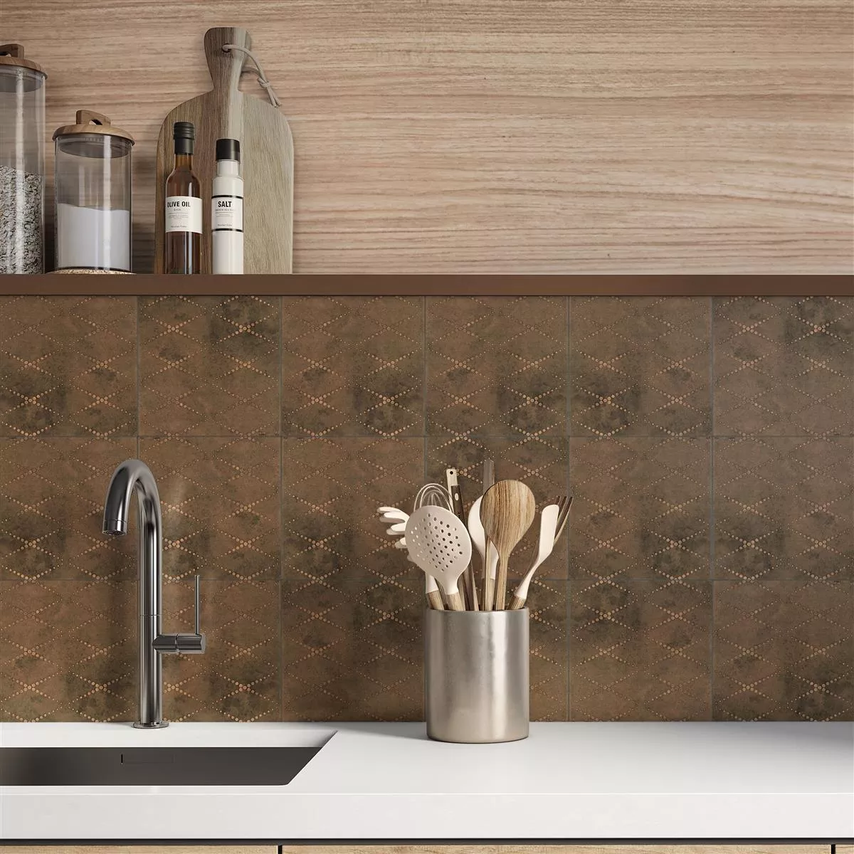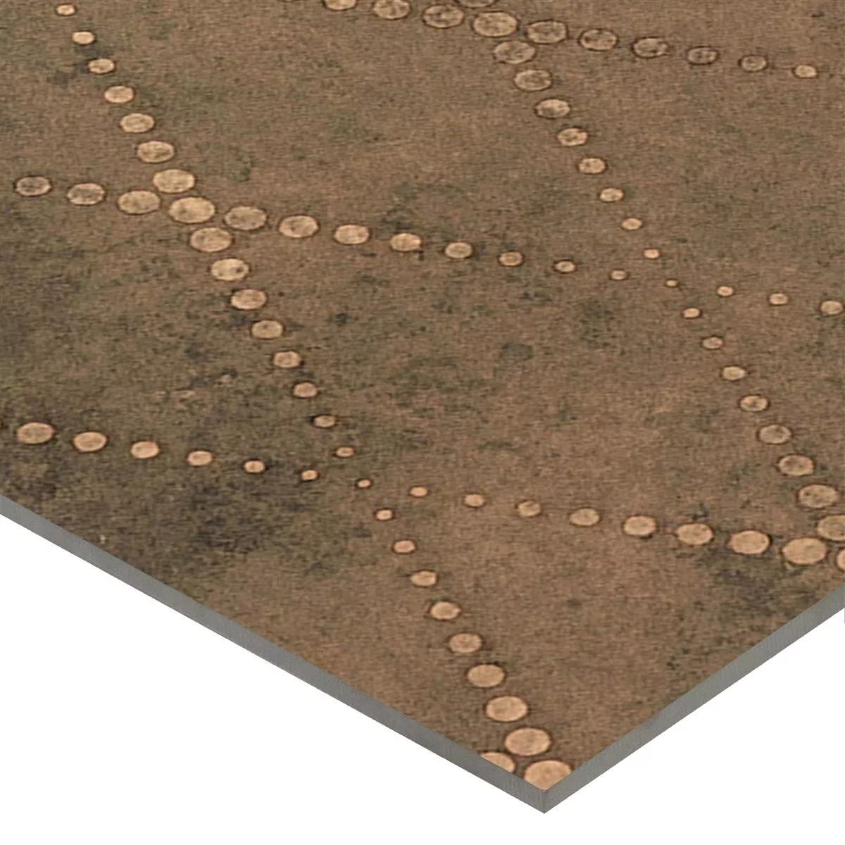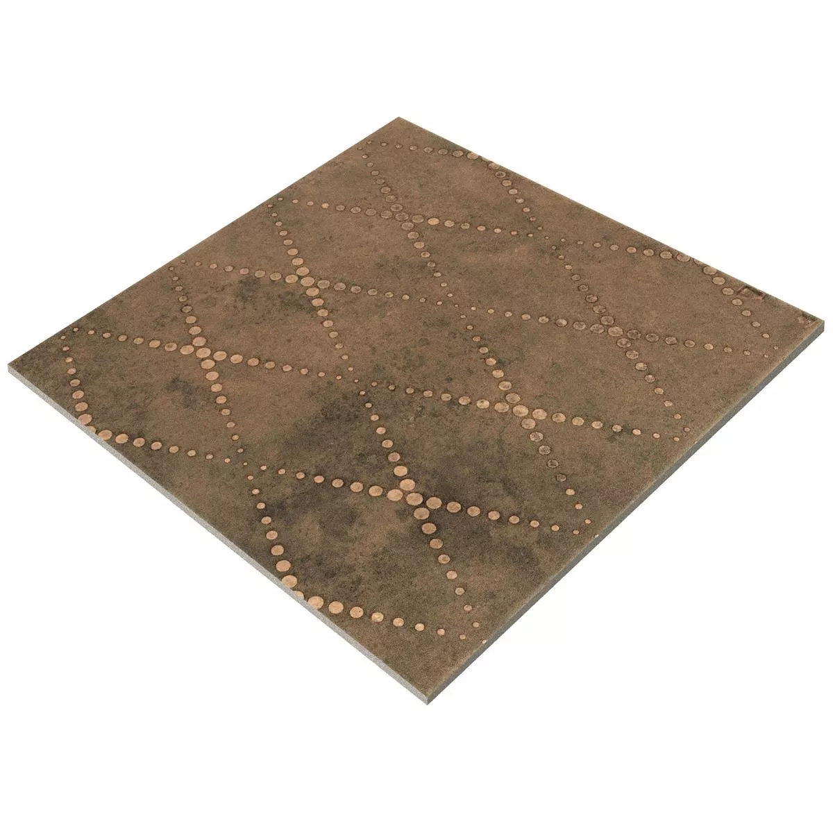 Discover the Chicago floor tiles in metal look bronze R9, measuring 18.5x18.5cm and a thickness of 8mm. The tiles are presented in an elegant copper color and are made of high-quality porcelain stoneware. These versatile tiles can be used as both wall tiles and floor tiles and give your room a unique vintage look.