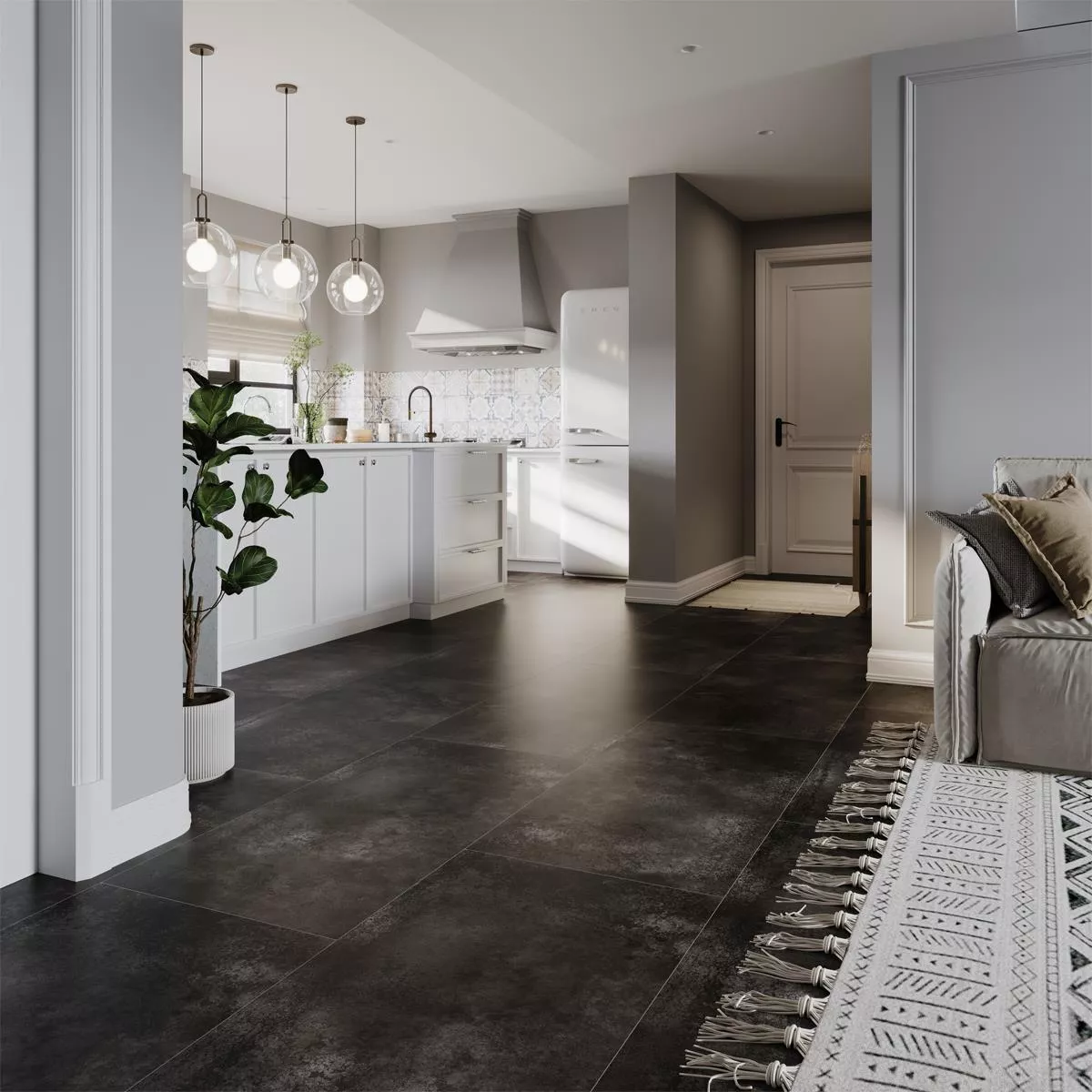 The Oregon porcelain stoneware floor tile in black impresses with its elegant metallic look and gives every room a modern, stylish atmosphere. With its generous format of 60 x 120 cm, it provides an elegant, seamless look and is suitable for both floors and wall cladding. The matt, glazed surface underlines the timeless design and makes the tile particularly easy to clean.