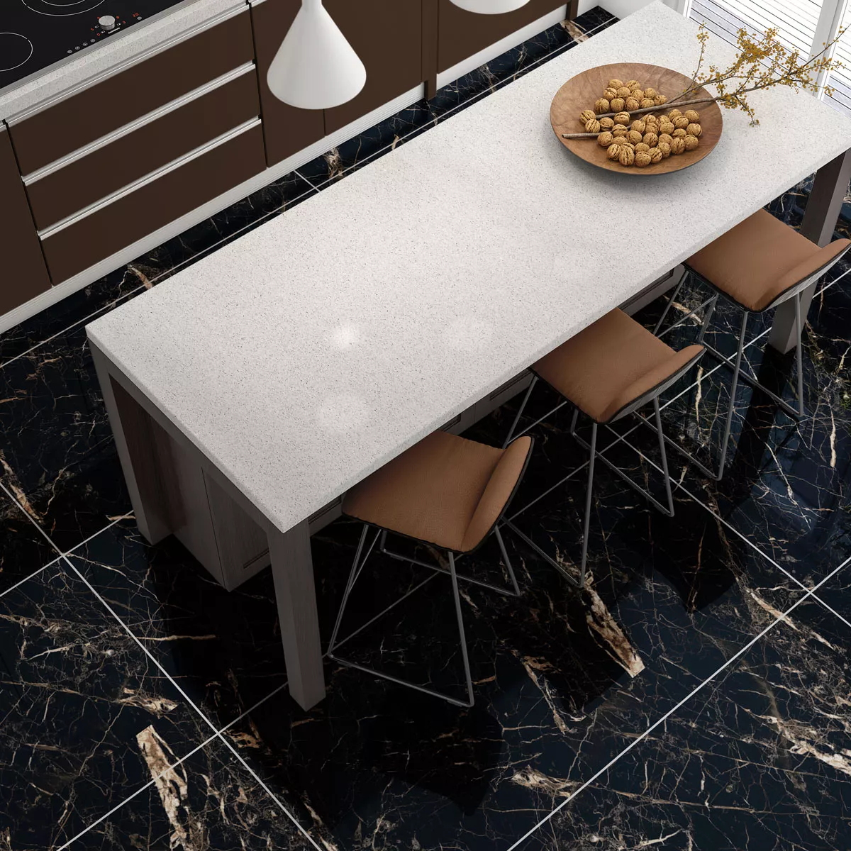 Add a touch of luxury to your home with our exquisite Trento floor tiles. These stunning black tiles with gold accents perfectly mimic the timeless beauty of marble, bringing refined elegance to any room.