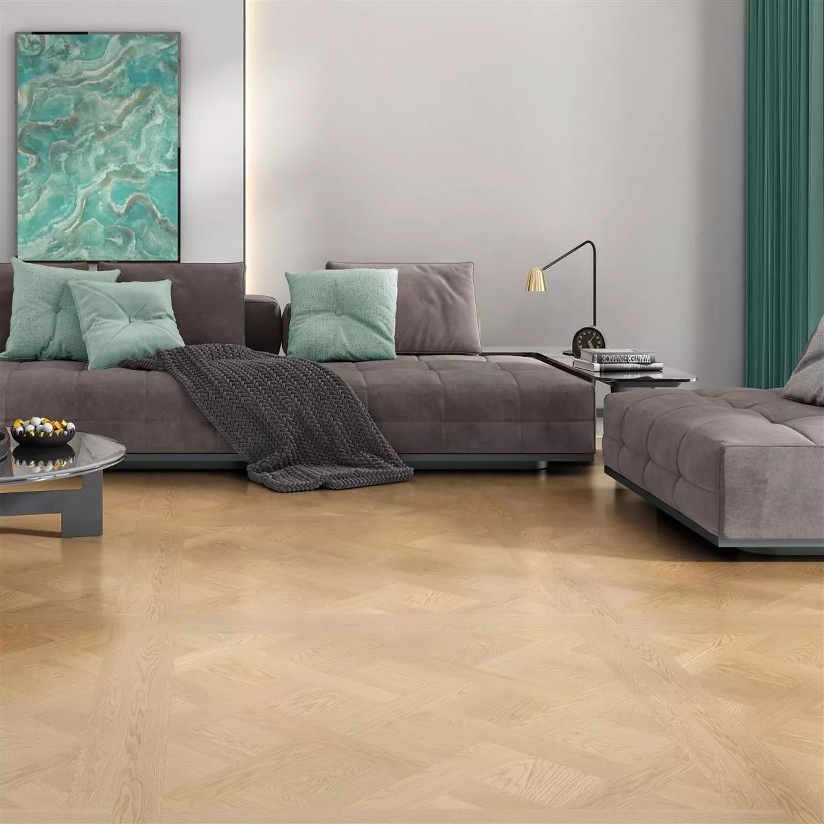 The Lavrio tiles are available in a generous format of 120 x 120 cm and a thickness of 9.5 mm. The matt surface skilfully imitates the natural wood structure and creates a warm, inviting ambience in any room.