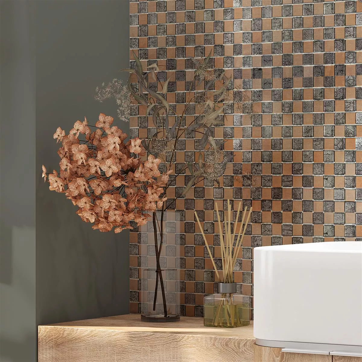 With the glass aluminum mosaic tiles Eldorien Copper Gray you can create a room that combines modernity and elegance in perfect harmony. Bring a unique personality into your home with this stylish contrast.