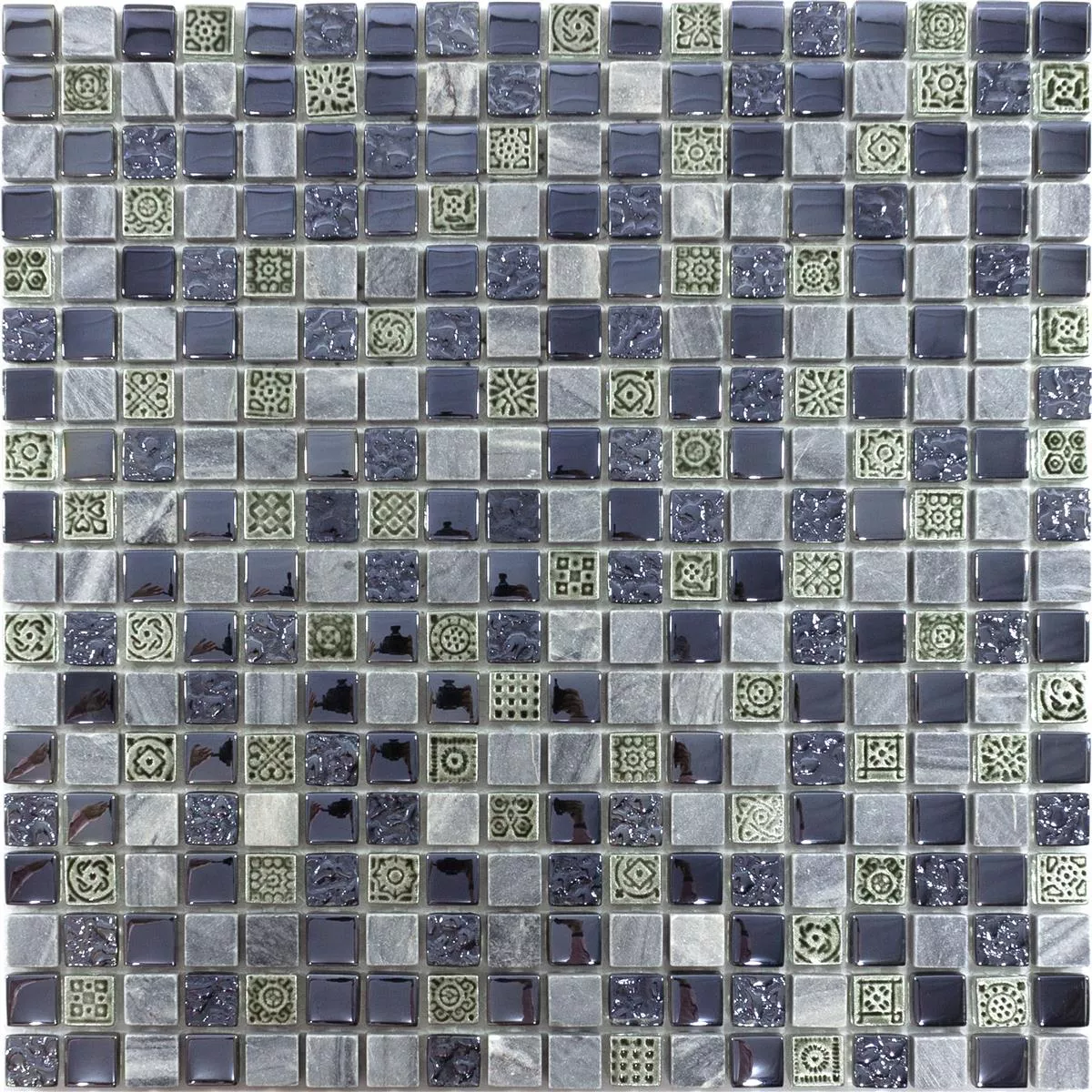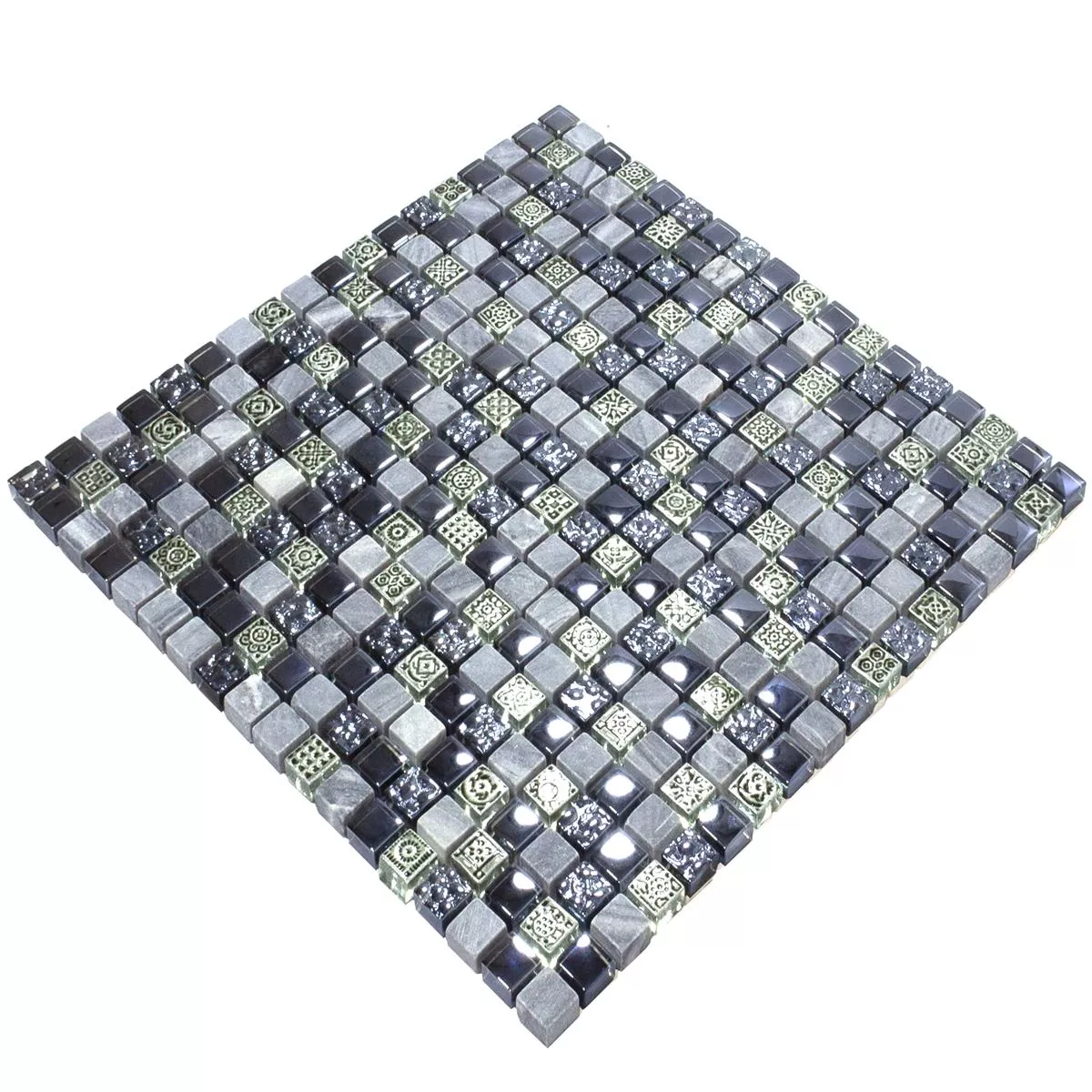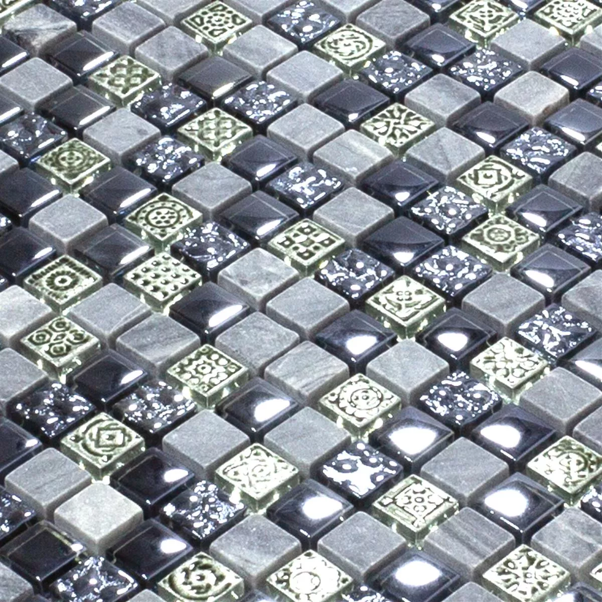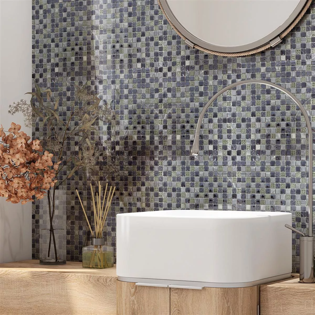 Experience modern luxury with the glass marble mosaic tiles Champion Black Gray Mix. The elegant combination of gray and black, paired with a varied surface of matt, glossy and structured, creates a contemporary look. These mosaic tiles, made from natural stone, marble and glass, offer not only visual sophistication but also robustness.