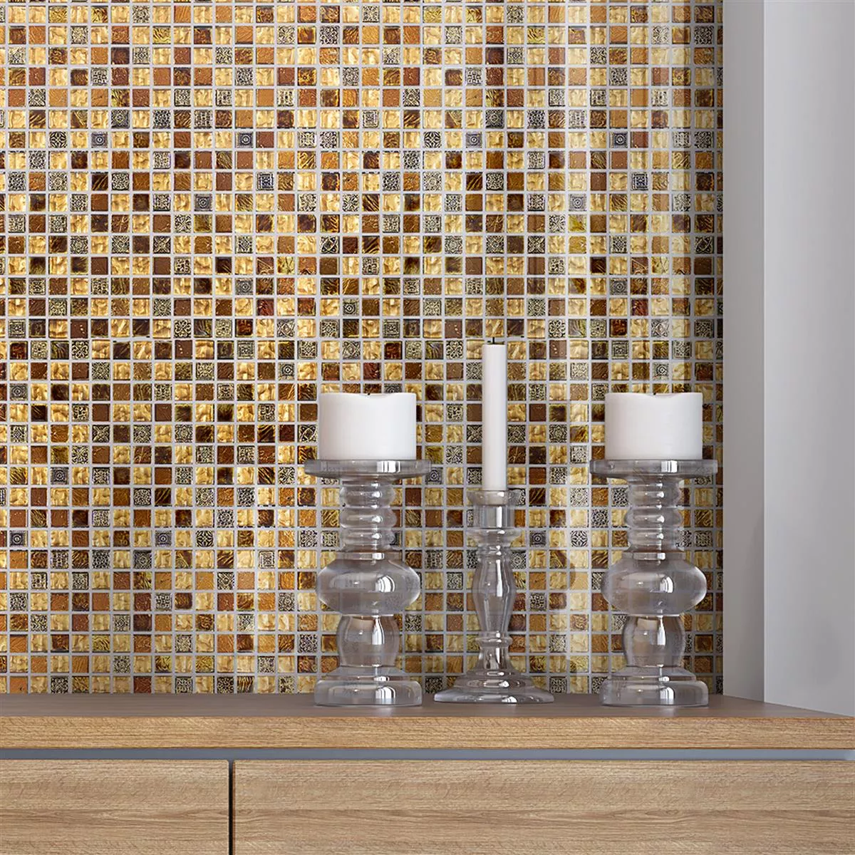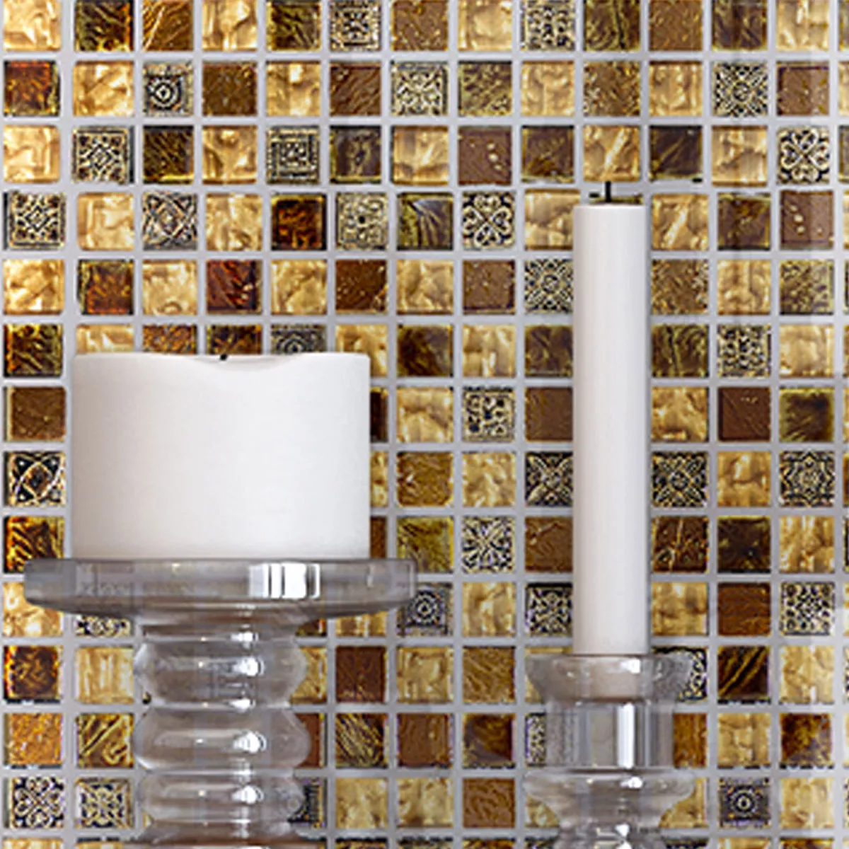 The "Majestic" mosaic tiles combine the elegant beauty of glass and marble in a breathtaking design. The combination of brown and gold gives your room a luxurious and majestic character. These mosaic tiles are not only visually stunning but also of the highest quality to add elegance and sophistication to your space.