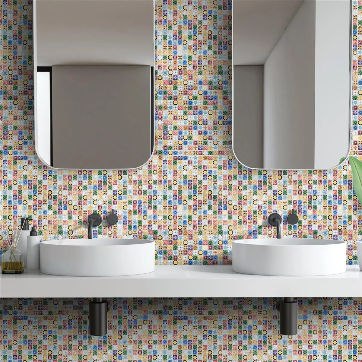 The mat on which the tile is glued can be easily and quickly laid to create a unique mosaic. With the mat, obstacles such as pipes can be easily overcome when laying. Fine nets with the Marrakech glass mosaic tiles are also suitable for laying directly over edges and steps. Small deviations in the look of the individual stones create a natural look.