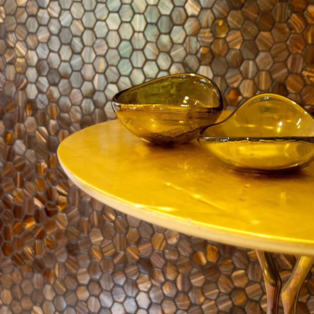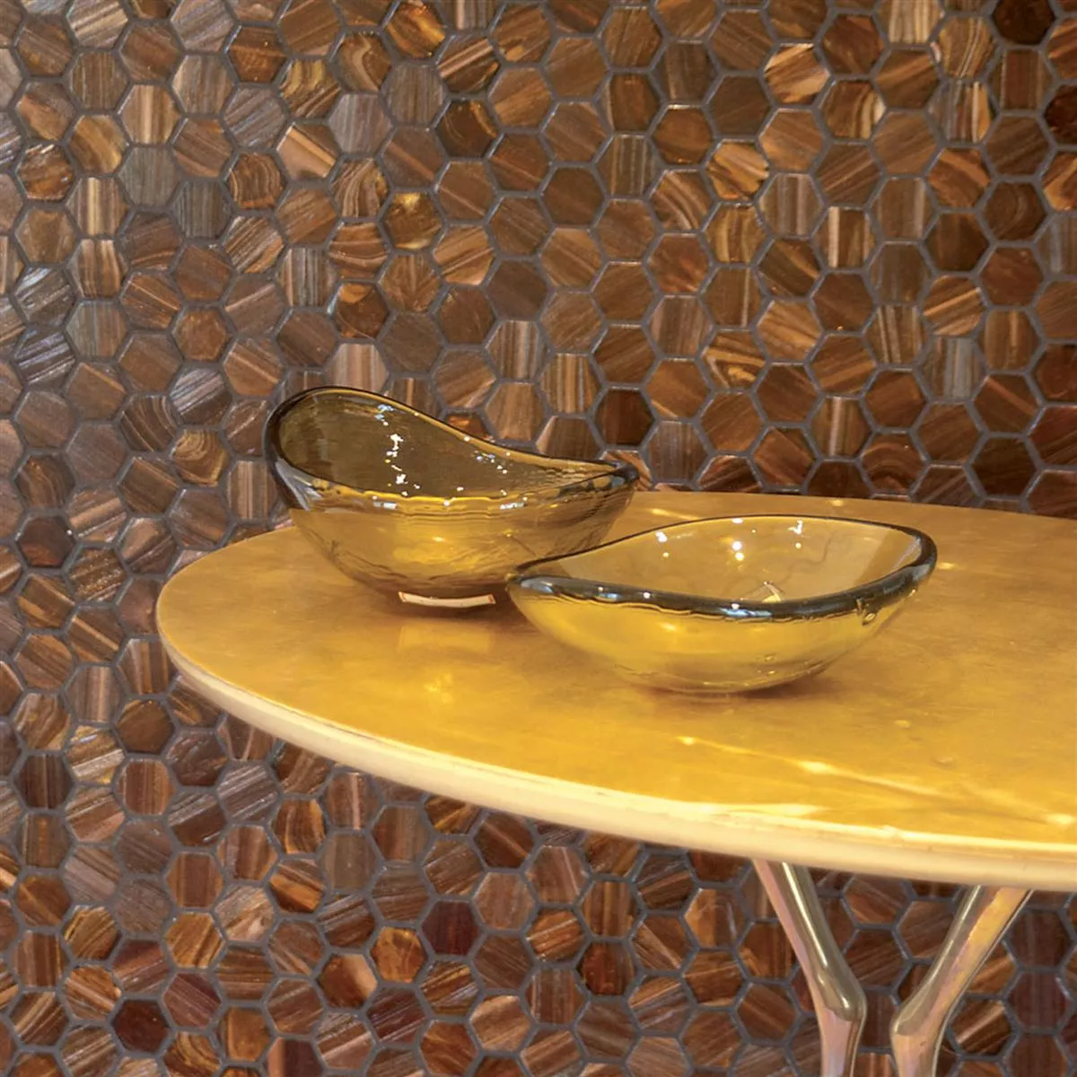 Immerse your rooms in a unique ambiance with our glass mosaic tile from the Hexagonal tile series. This versatile glass mosaic tile is suitable for a wide variety of applications. It's ideal for indoor use, such as bathrooms, kitchens, or conservatories. It's also suitable for outdoor use, such as garages or poolside areas.