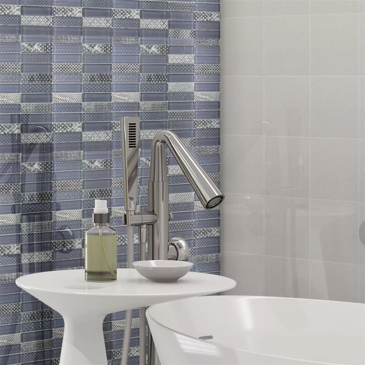Discover the harmonious combination of natural stone and glass in our Celestiana Ornament Brick Mix mosaic tiles. The gray color palette and the attractive brick mix design make these tiles a perfect choice for a timeless and modern interior design.