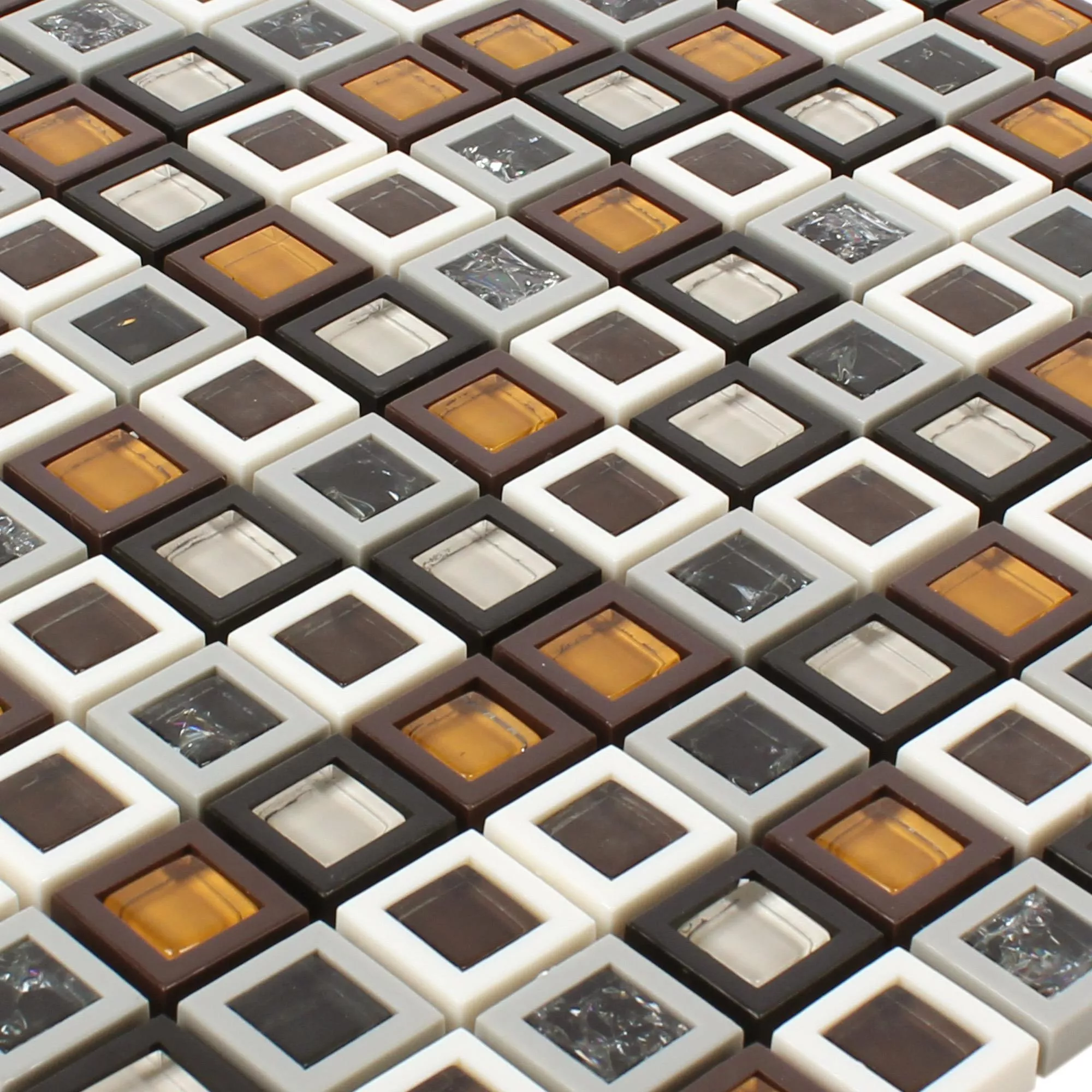 The mosaic tiles in the green-white package combine bright white with accents in various shades of green, some of which tend towards bluish. In the other light variant, white, dark and yellow-brown glass set color highlights. The individual wall tiles are each bordered by a white frame.
