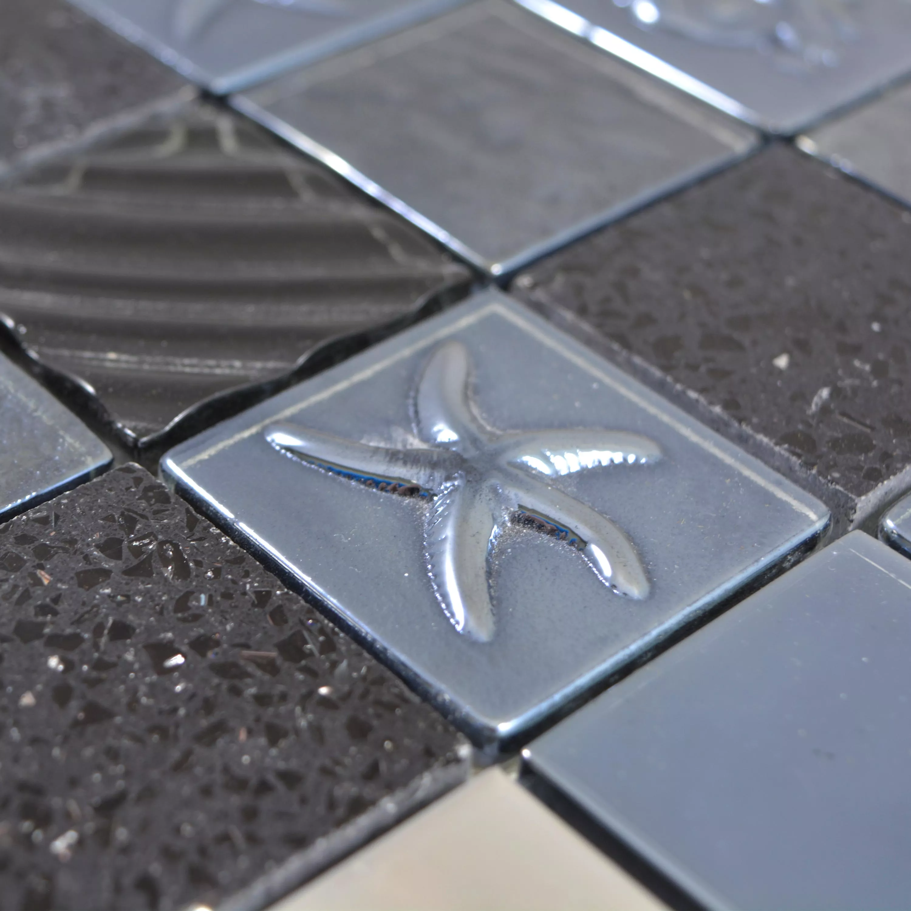 The Emporia tile is available in black and silver. They have a beautiful surface gloss and are provided with a 3D structure. Depending on the space for which the tiles are used, the 3D effect can be displayed in the form of kitchen utensils or sea creatures. The tiles are of course also suitable for wet areas. They can be installed both indoors and outdoors. The tile mats are available in square and rectangular shapes with a thickness of 8 mm. These are mosaic mats. The mosaic stones do not have to be placed individually on the walls.