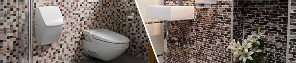 Our special mosaic tile mix gives the room a very individual and organic ambience. This is made possible by the different mosaic tiles on a mat, such as mosaic mixtures with glass, ceramic, porcelain stoneware and natural stone (e.g. marble, granite, slate, limestone, quartzite, onyx, pebble and travertine mosaics).