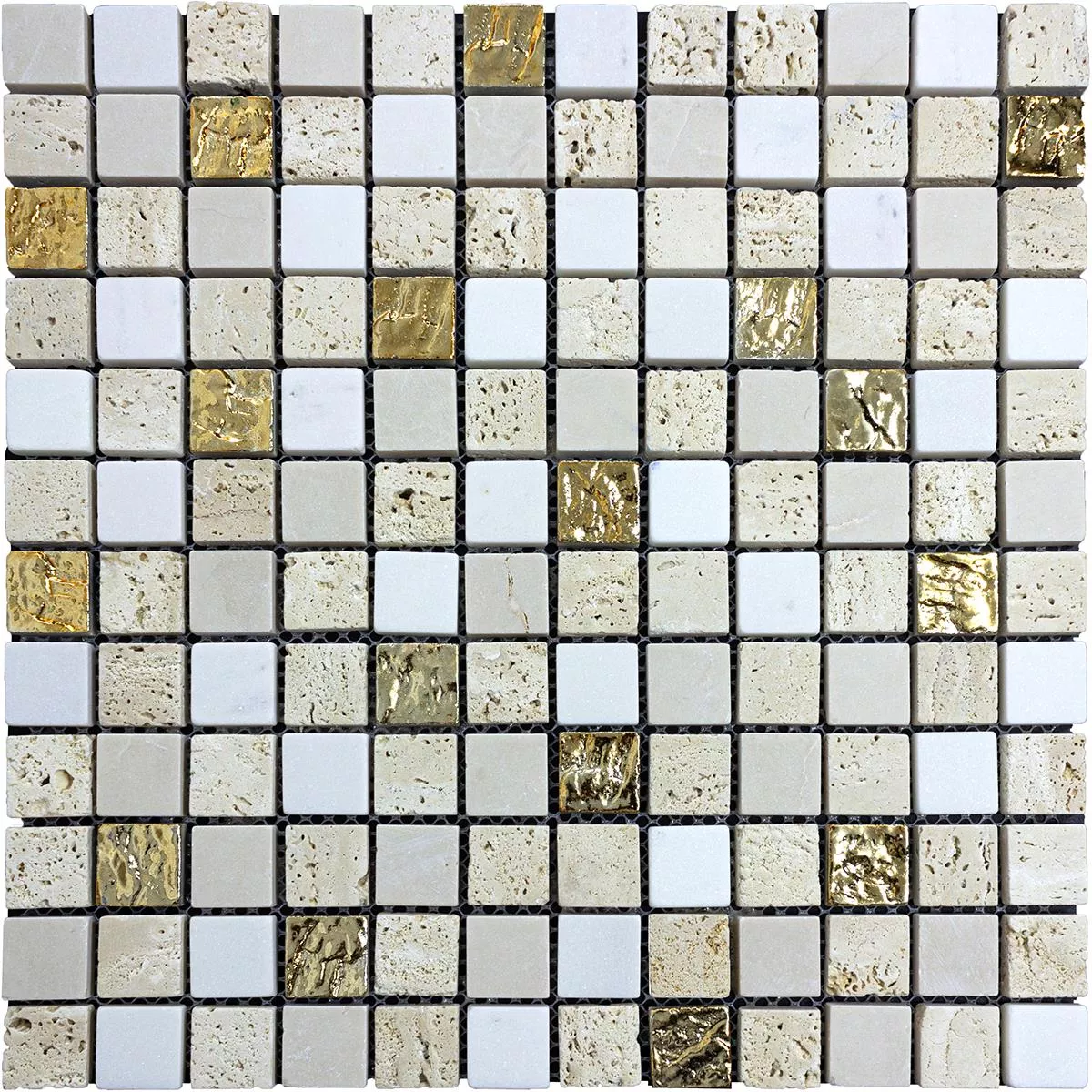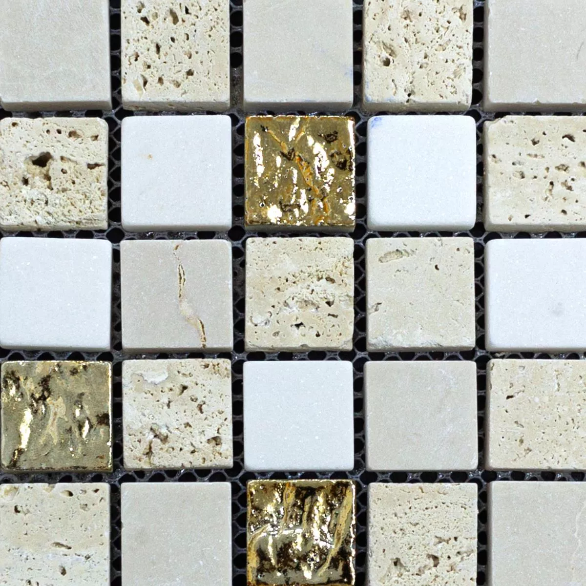 Experience luxury with our marble natural stone mosaic tiles Limonello Gold Cream. These square wall tiles with a stone size of 20x20mm will give your interior an elegant color palette of gold, cream and beige. The matte surface and structured texture create a luxurious atmosphere.