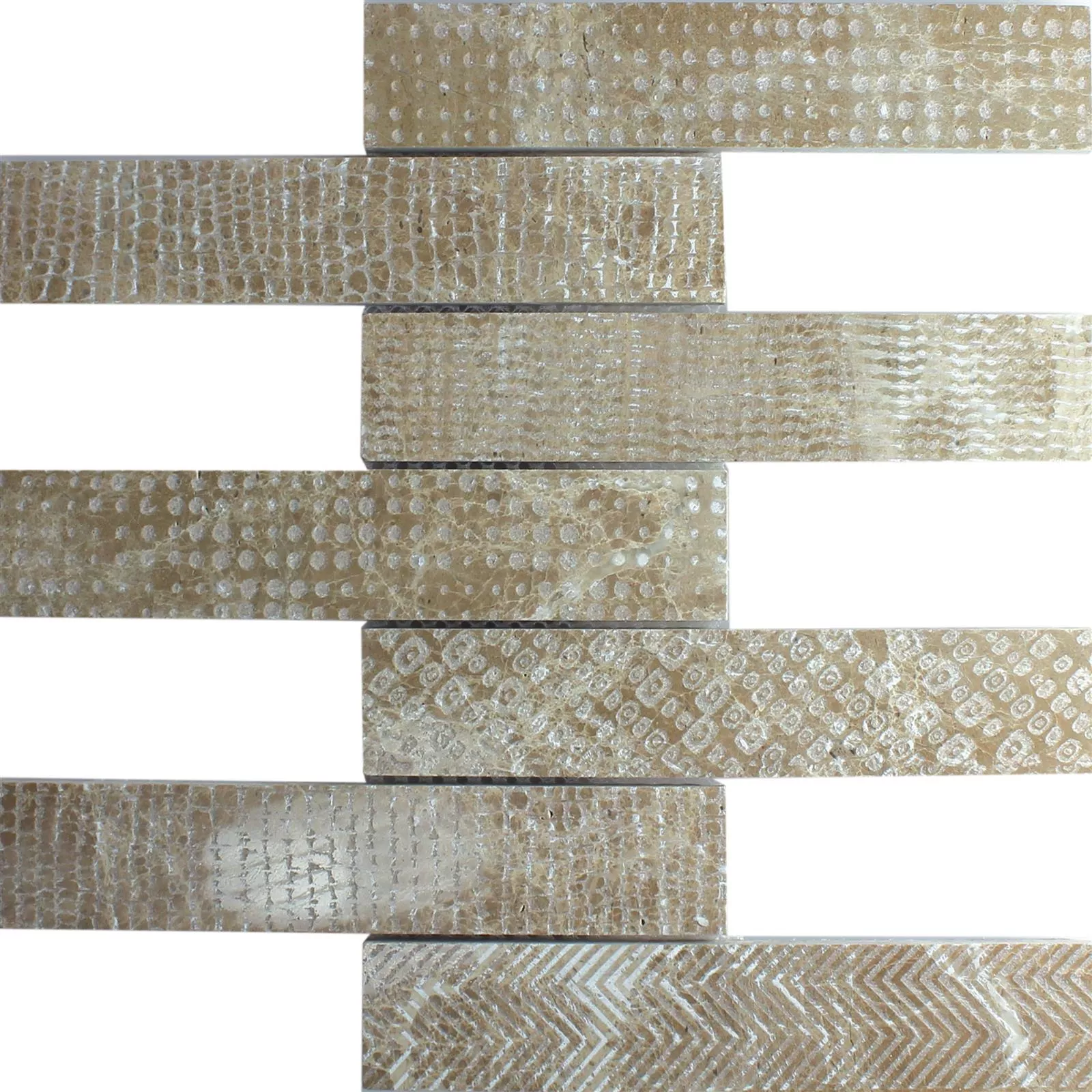 The marble natural stone stripe mosaic tile Grover is made of the natural stone marble. The mosaic tile is a special highlight due to the large number of different surface patterns that can be combined. The Grover natural stone tile, for example, is available with a dotted, striped, jagged or wavy pattern. That is why the Grover tile is well suited for combining with other simple tiles and decoratively enhances your room. The Grover mosaic tile makes your living space look very interesting and extremely varied.