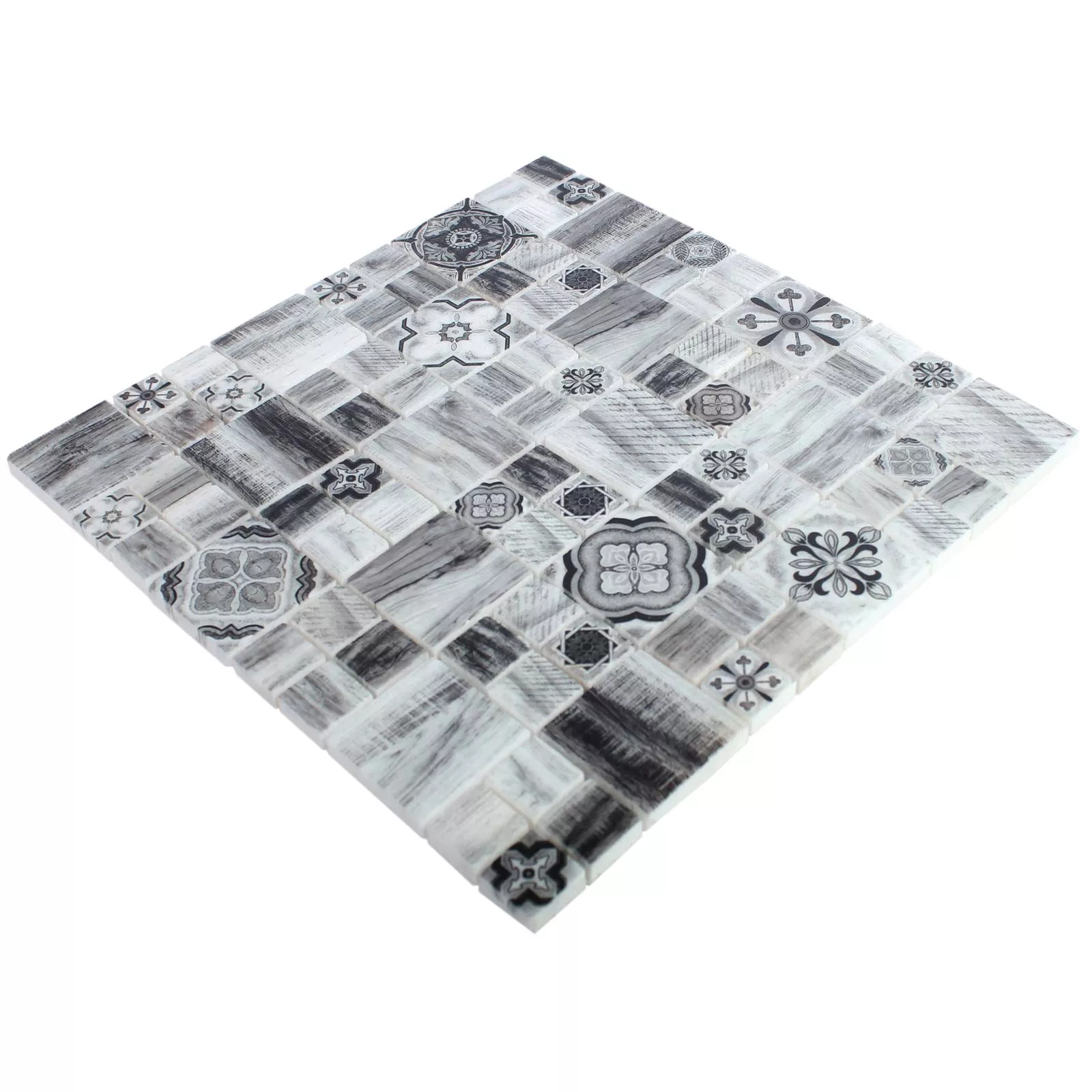 When it comes to the color of the Portland mosaic, you can choose between a timelessly simple variant in shades of gray and one in light brown. The matt surface of the tiles underlines the wood look of the pattern and creates a warm atmosphere. In the brown color scheme, blue accents on individual tiles add a visual highlight.