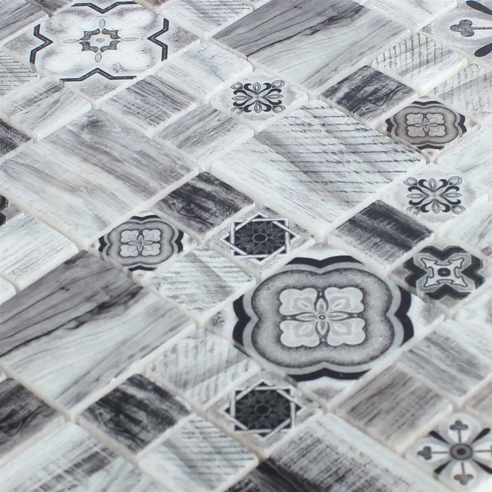 The mosaic of the marble tiles Portland captivates with varied surface patterns in wood look.