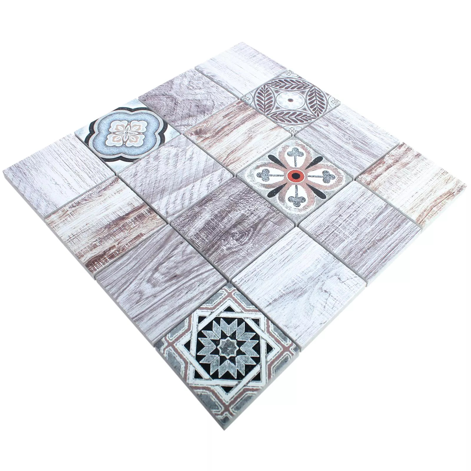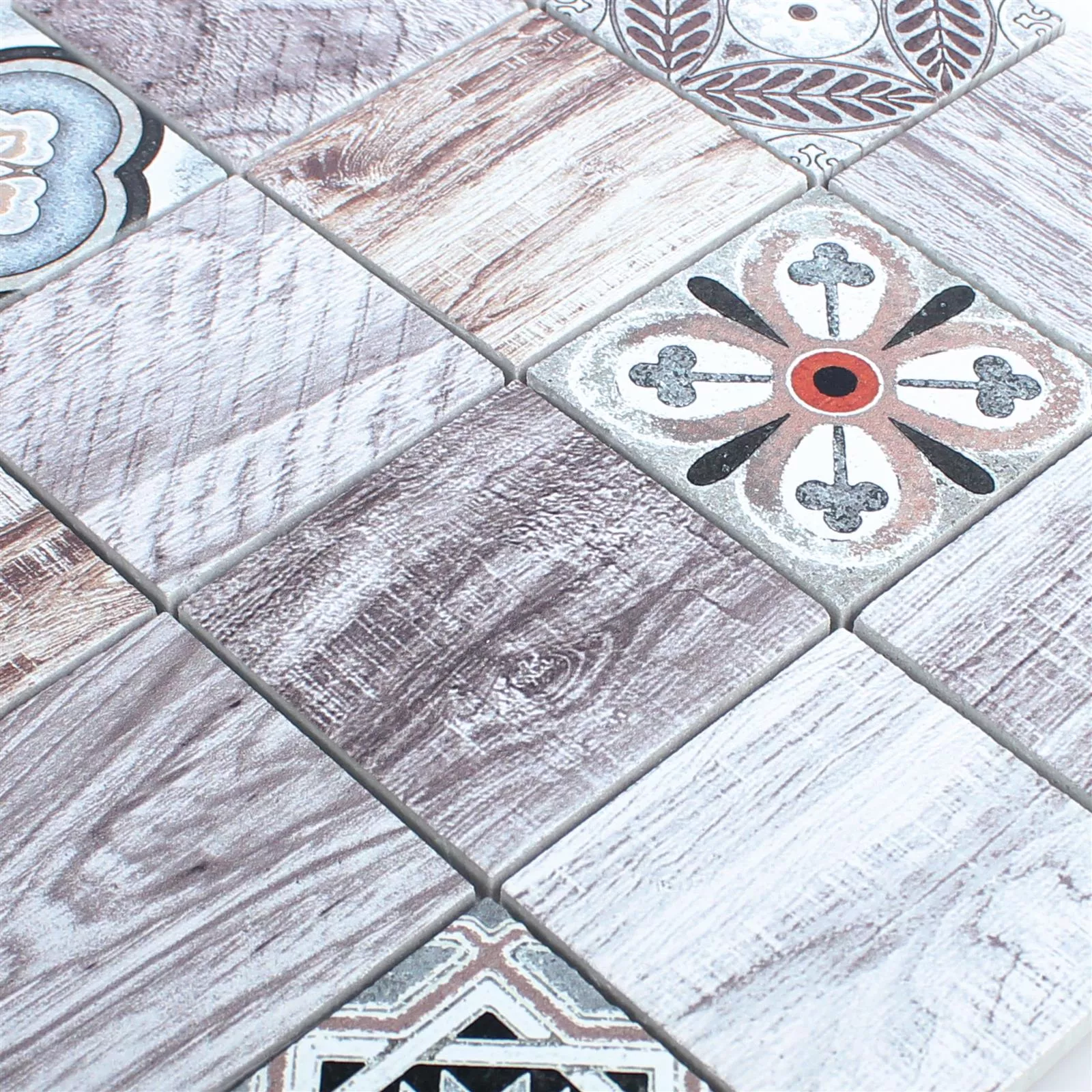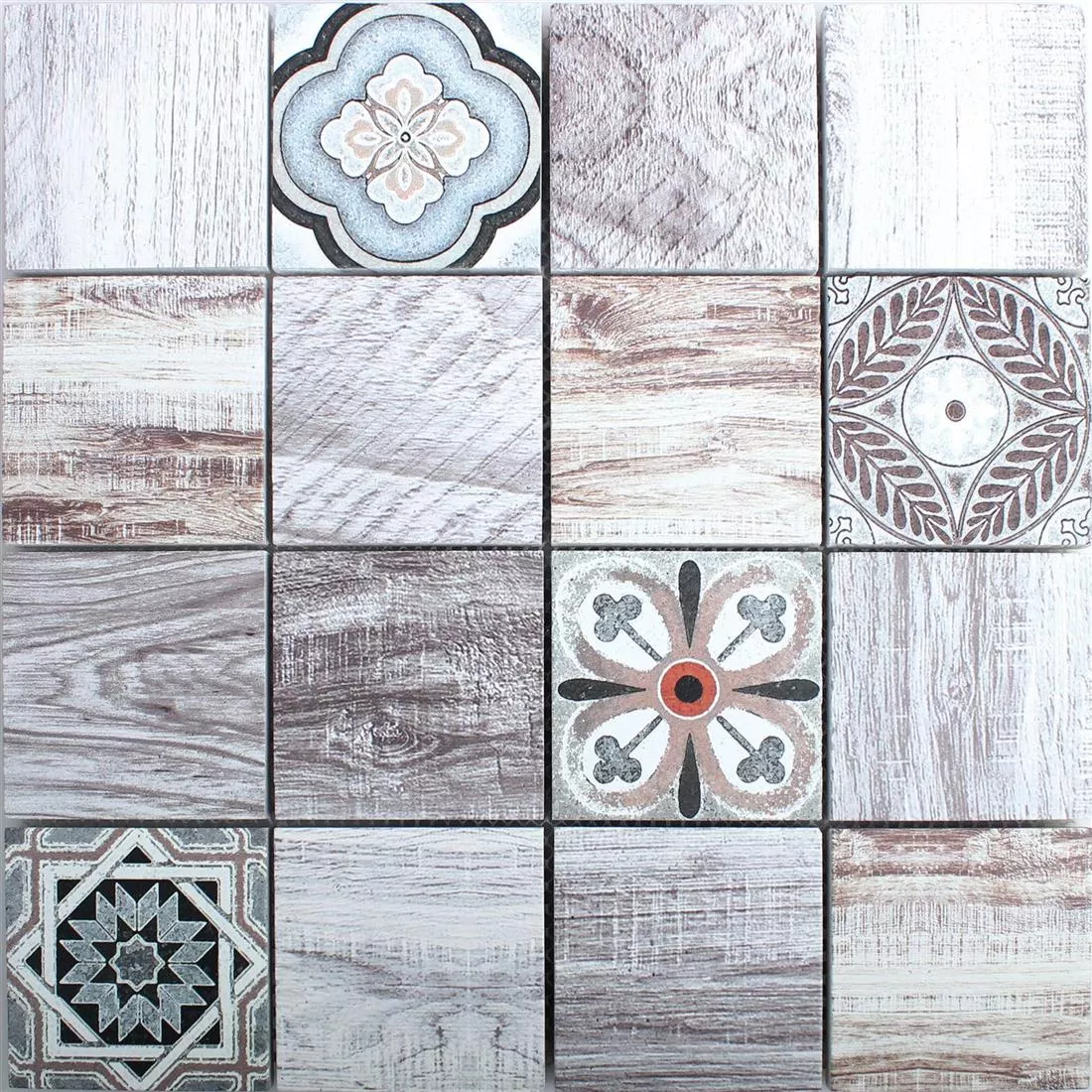 With the creative mix of the Yaren mosaic you can design your floors and walls in style. A mosaic mat of this design includes light brown colored tiles with different, detailed wood grains. It realistically imitates wooden floorboards, even knotholes, cuts and notches in the wood are reproduced. Four further natural stones form the highlight of the mosaic. They are designed with different tile patterns in a classic style. Pops of black, blue and orange in these tiles add vibrant accents to the wood-oriented color scheme. When used, the marble tiles of the same size in this original combination enable a uniform and at the same time varied overall appearance. Each tile in the mix has an individual surface pattern, giving you the greatest possible freedom in its arrangement to implement your personal ideas.