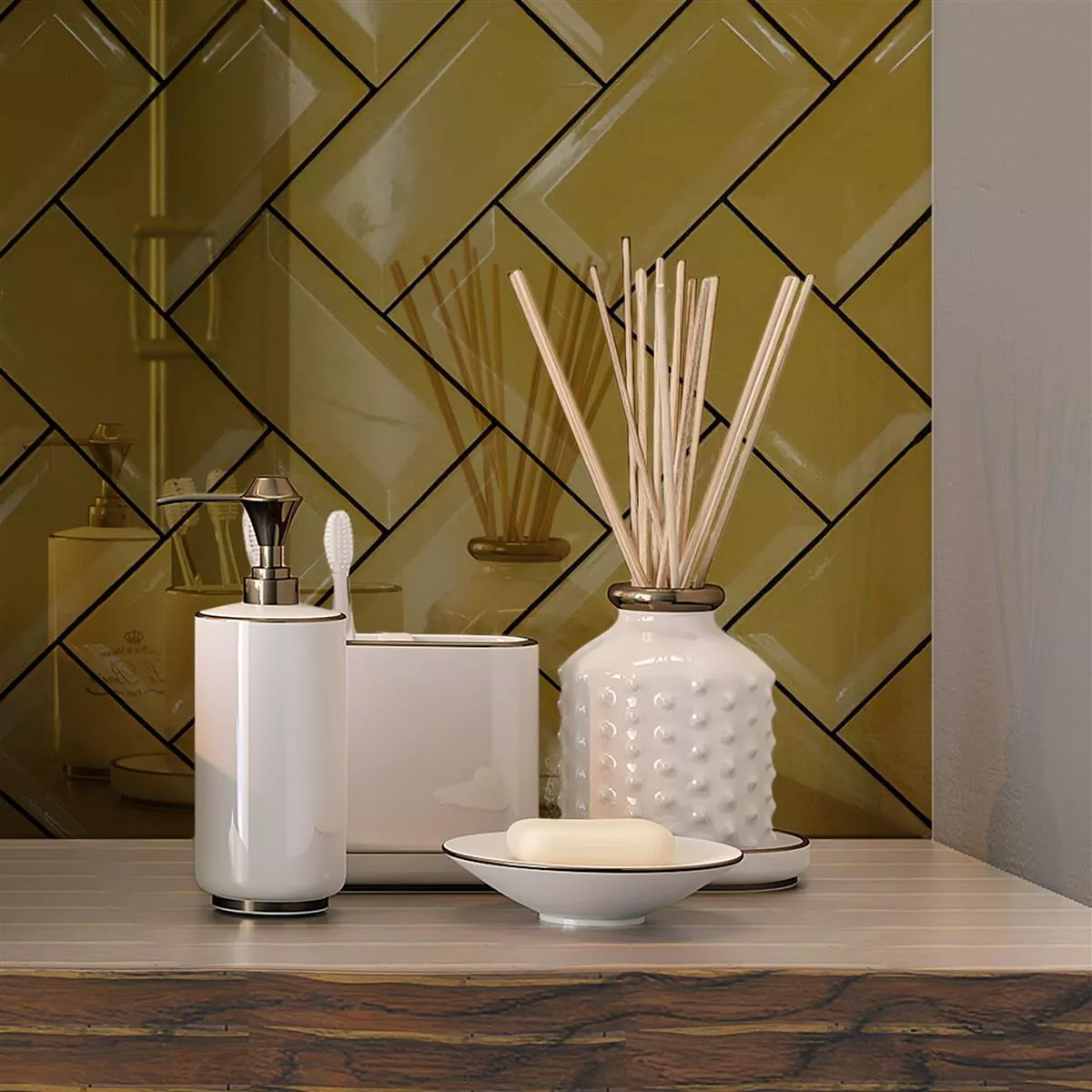 The wet area approval makes them a practical choice for any environment. Available individually, they enable creative wall designs, while their high-quality workmanship and appearance ensure timeless shine. Create a stylish atmosphere in your rooms with Heliopolis Facette Gold.