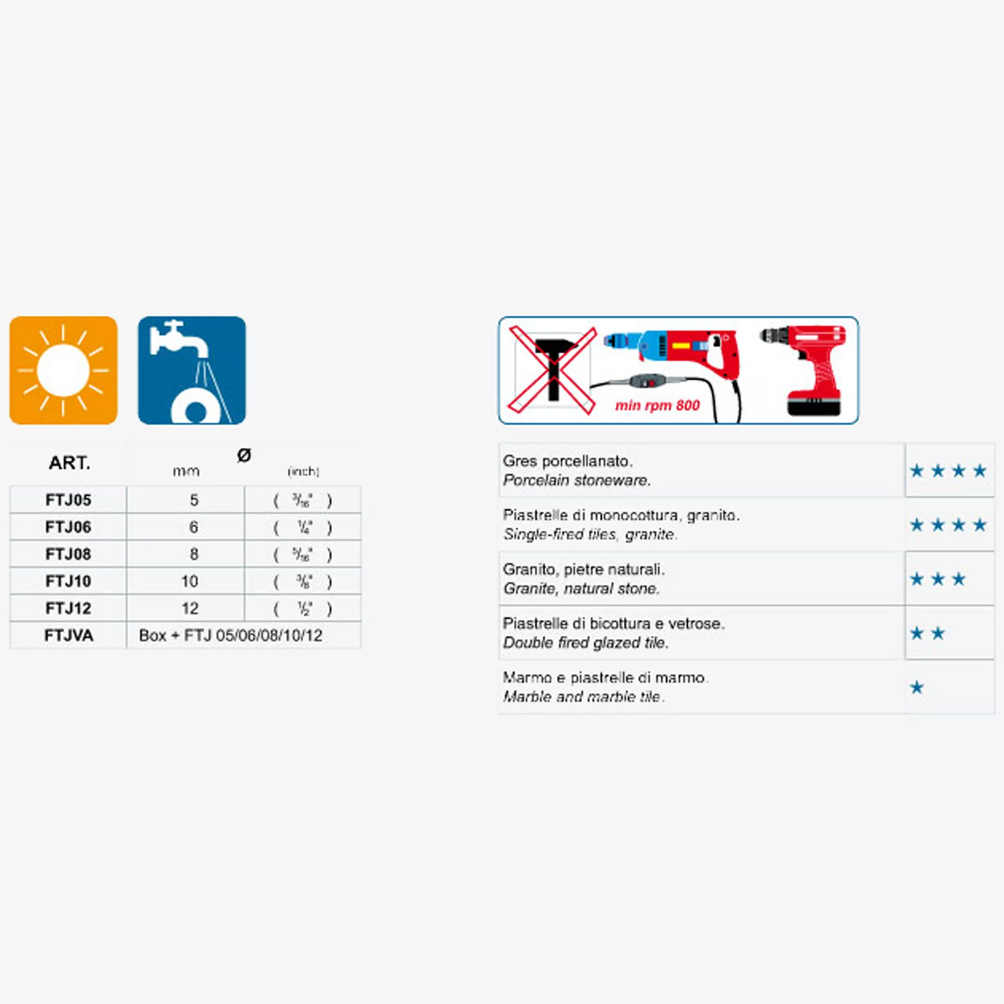 The drill bit with diamond is suitable for a drill with 800 revolutions per minute or more. The crown is not applicable at lower speeds. It ensures a clean cut and tries to prevent cracks in the tiles. Each size is available individually. To make it easy to distinguish from other manufacturers, it was painted green. The individual sizes are 5mm, 6mm, 8mm, 10mm and 12mm diameter. To achieve the best results, it is recommended to wipe the surfaces clean beforehand. The tiles can be processed both individually and installed on the wall. Adding a little water to the drill bit prevents overheating. The diamond is long-lasting and can be used very well many times.