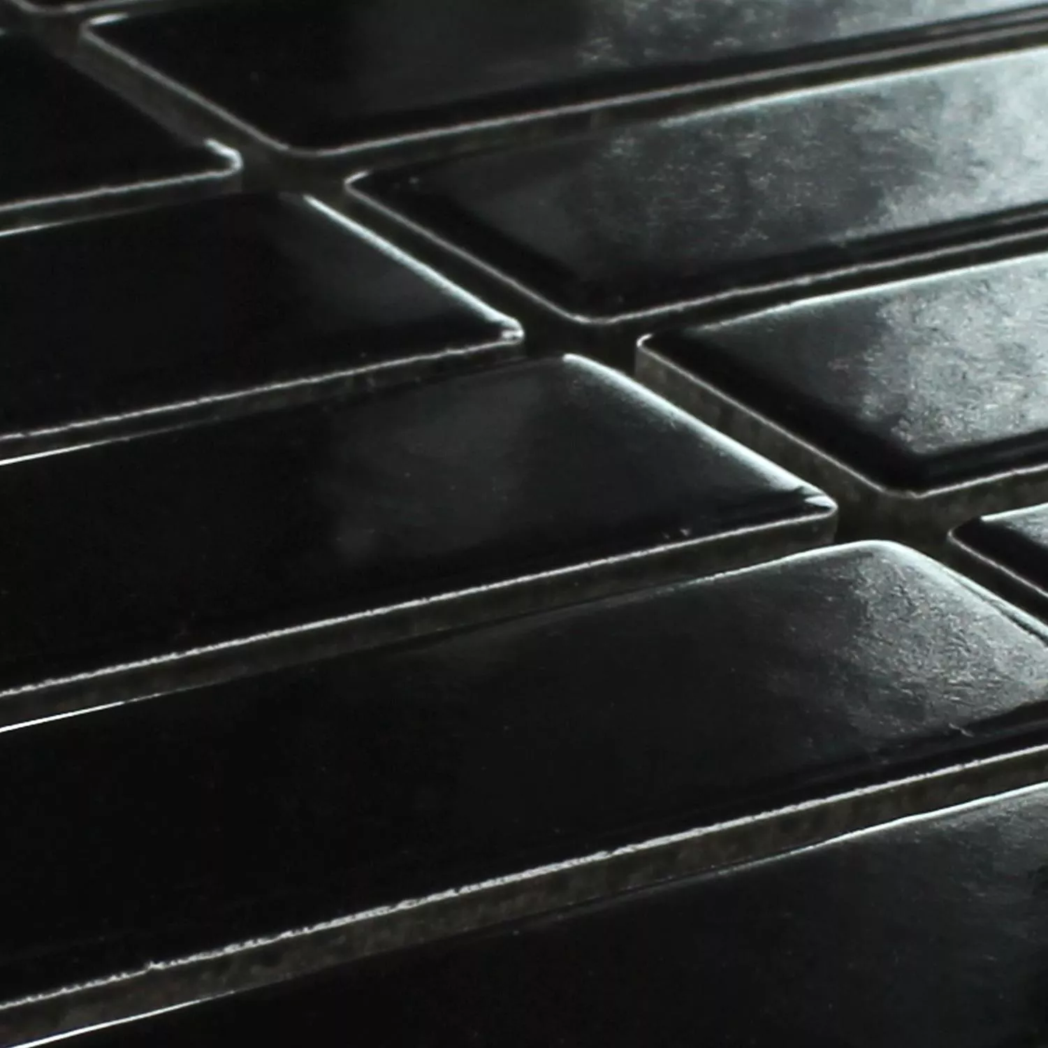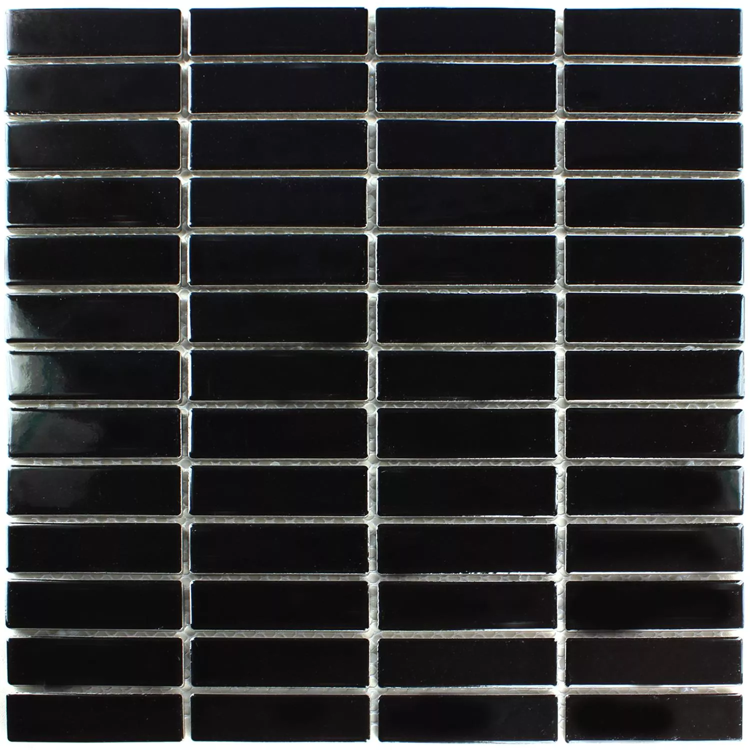 The ceramic mosaic tile, in the color black uni and a glossy surface finish, has a mat size of 298x318mm and a stone size of 21.9x72.8mm. The thickness of each stone is 0.6 cm.