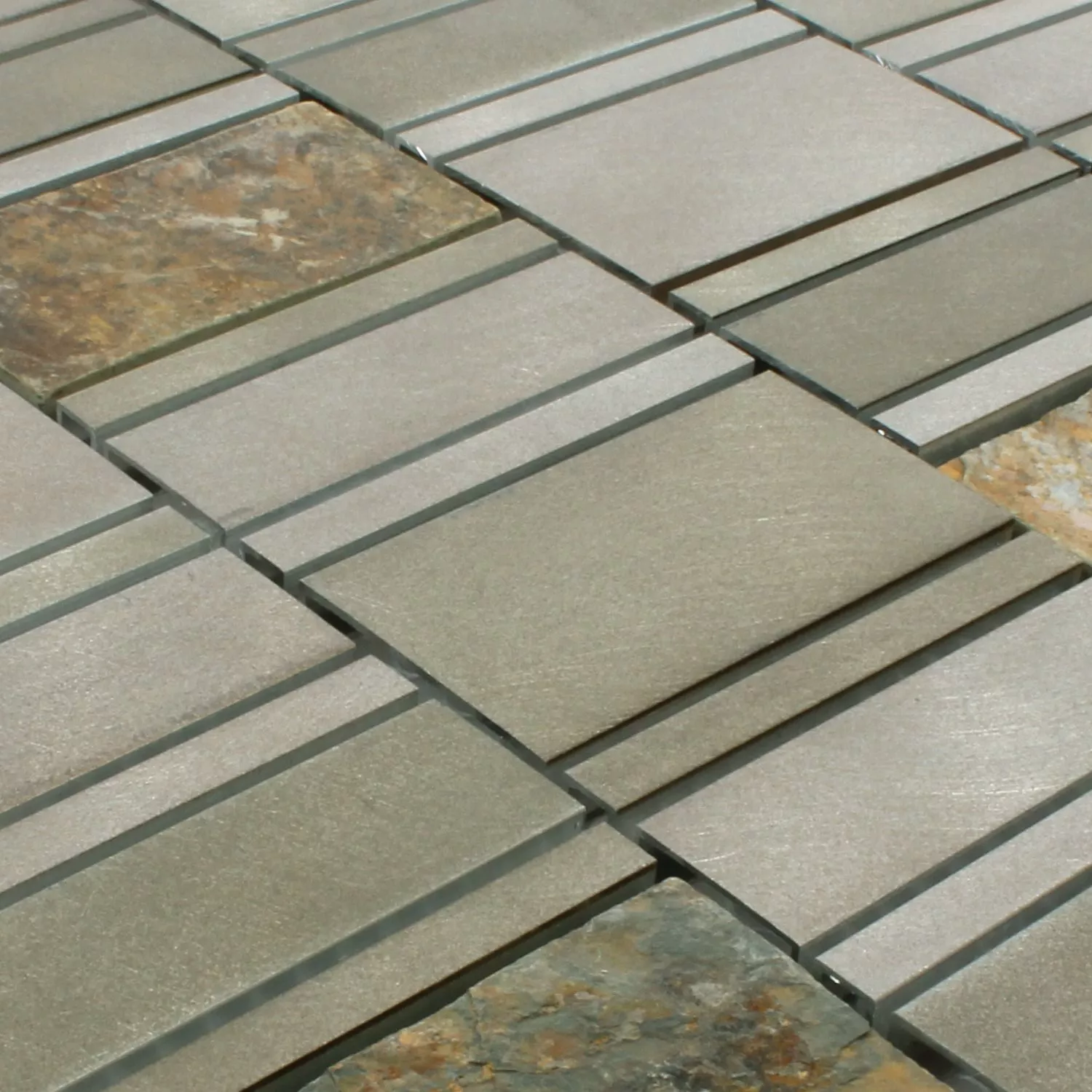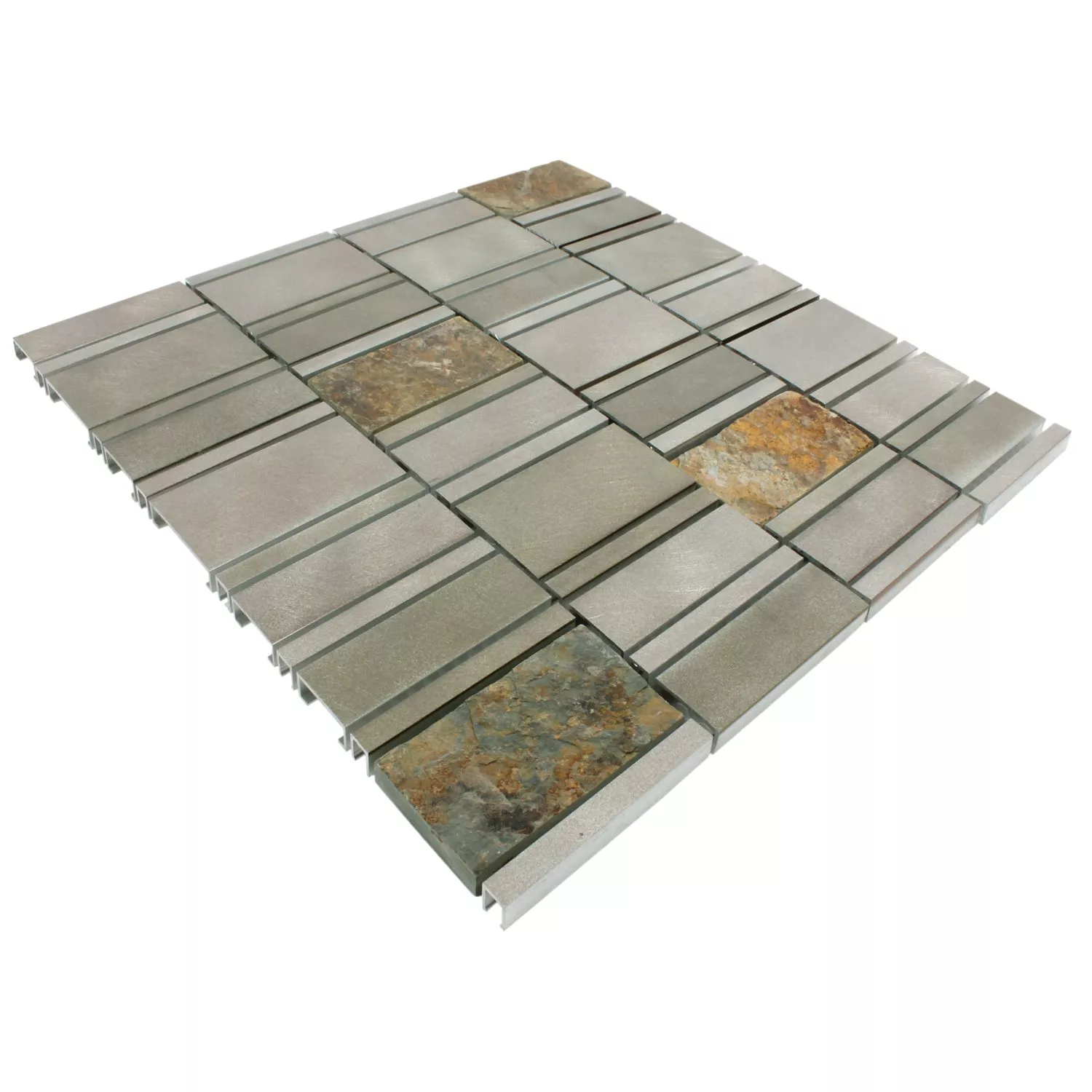 The traditionally shaped wall tiles are a good choice for the living area, the party room, the conservatory and also for the bedroom. Even in public spaces such as waiting rooms and treatment or meeting rooms, these aluminum natural stone tiles are the perfect basis for stylish furnishings. All Natural Stone Aluminum Avanti models are easy to maintain, so they always look as neat as the first day they were laid. The surface of the mosaic tiles is matt, so that these aluminum natural stone tiles can also be used as a subtle background in large rooms.