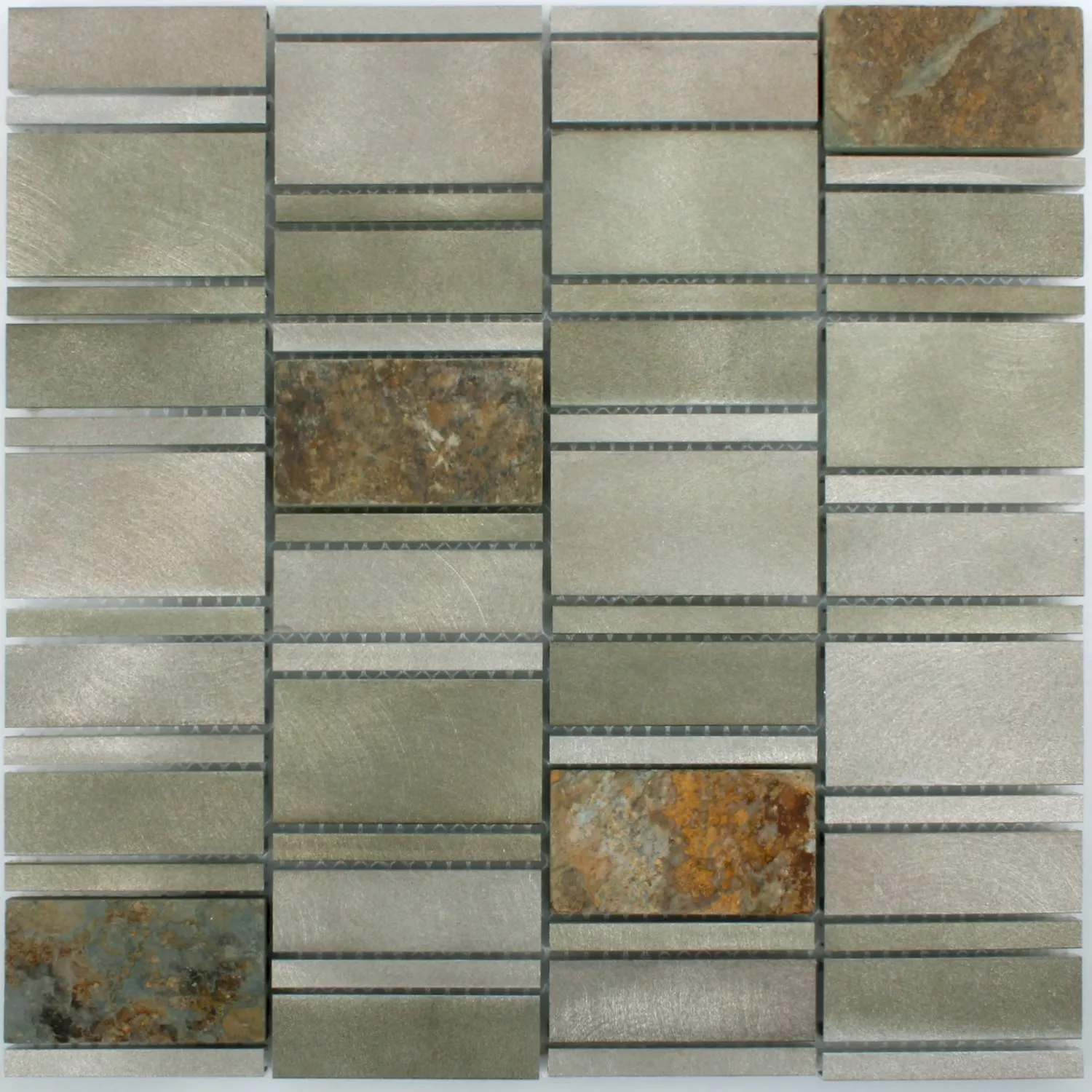 Modern mosaic tiles provide a touch of luxury on the wall, because many of the beautiful wall tiles impress with their unique design and high-quality materials. The Avanti models in brown are also impressive as aluminum natural stone tiles with the best workmanship in every detail. The fine mosaic tiles are easy to lay, so that they make walls shine in no time in a new building or after renovation in an old building. The subtly colored wall tiles are arranged in rectangles of different sizes, some made of aluminum and some made of natural stone. So every wall with the aluminum natural stone tiles remains a visual highlight in the room, because the eye of the beholder never gets bored with these beautiful mosaic tiles.